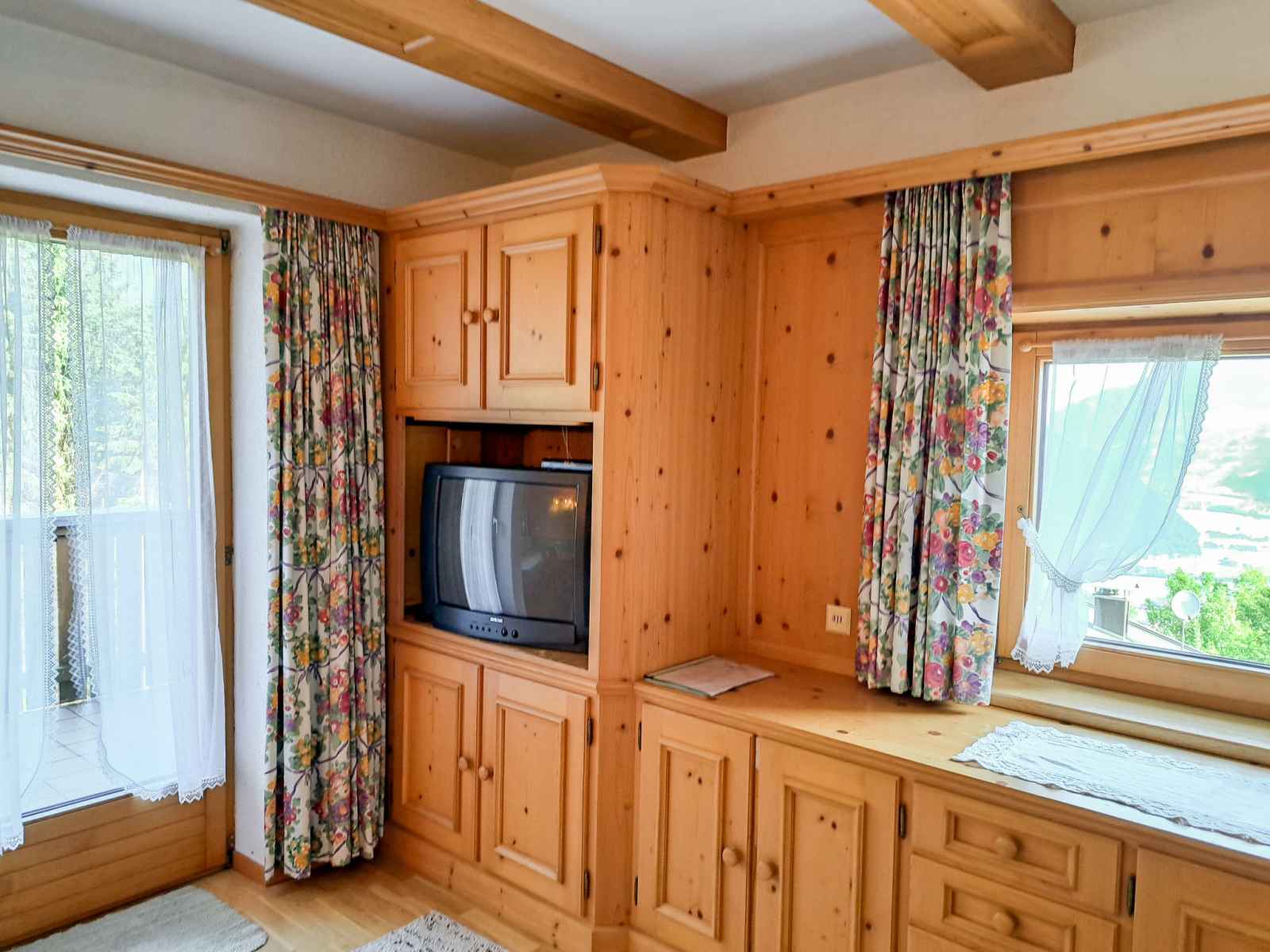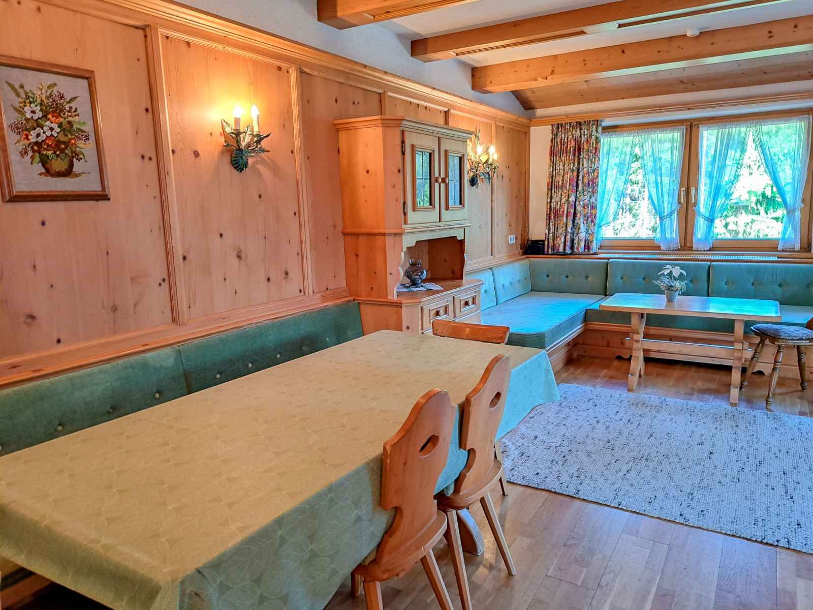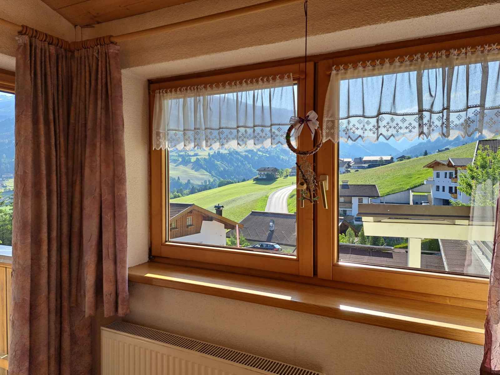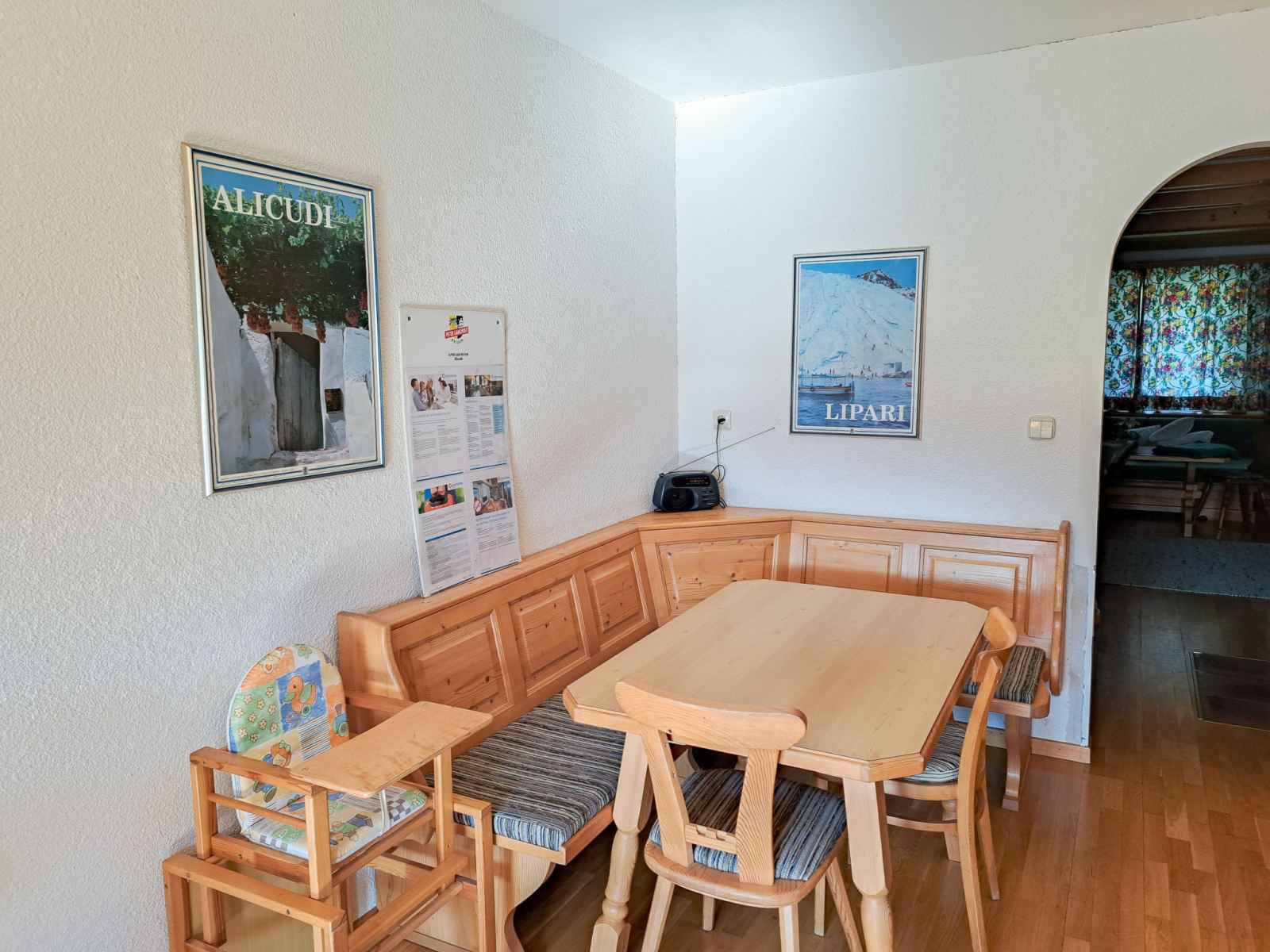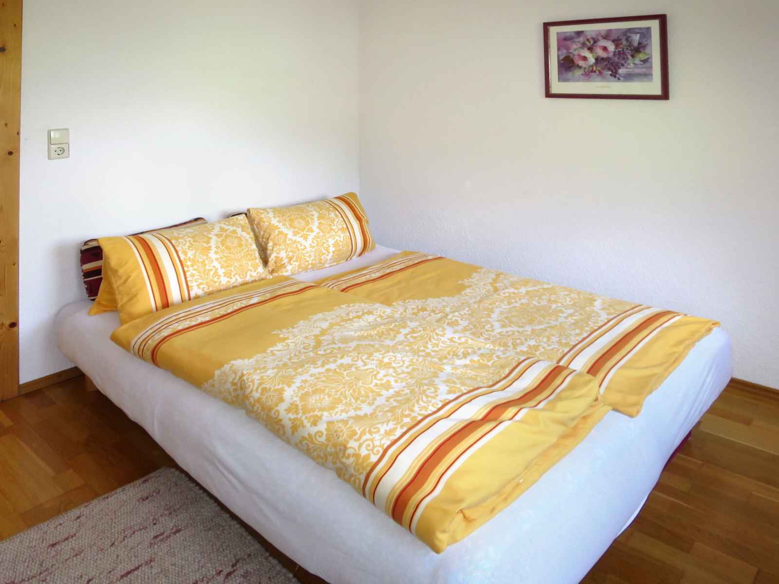 double. Sortie sur le balcon. Cuisine ouverte (four, lave-vaisselle, 4 plaques vitrocéramiques, grille-pain, bouilloire électrique, cafetière électrique) avec coin repas. Sortie sur le balcon. 2ème étage: 1 chambre, mansardée avec 1 lit, 1 lit double et WC séparés. 1 chambre, mansardée avec 2 lits et WC séparés. Bain/douche, double vasque. Chauffage au fuel. Sol en parquet. Balcon. Belle vue sur les montagnes et la vallée. A disposition: chaise haute pour enfant, lit bébé. Veuillez noter: maison non-fumeur. Détecteur de fumée, extincteur.