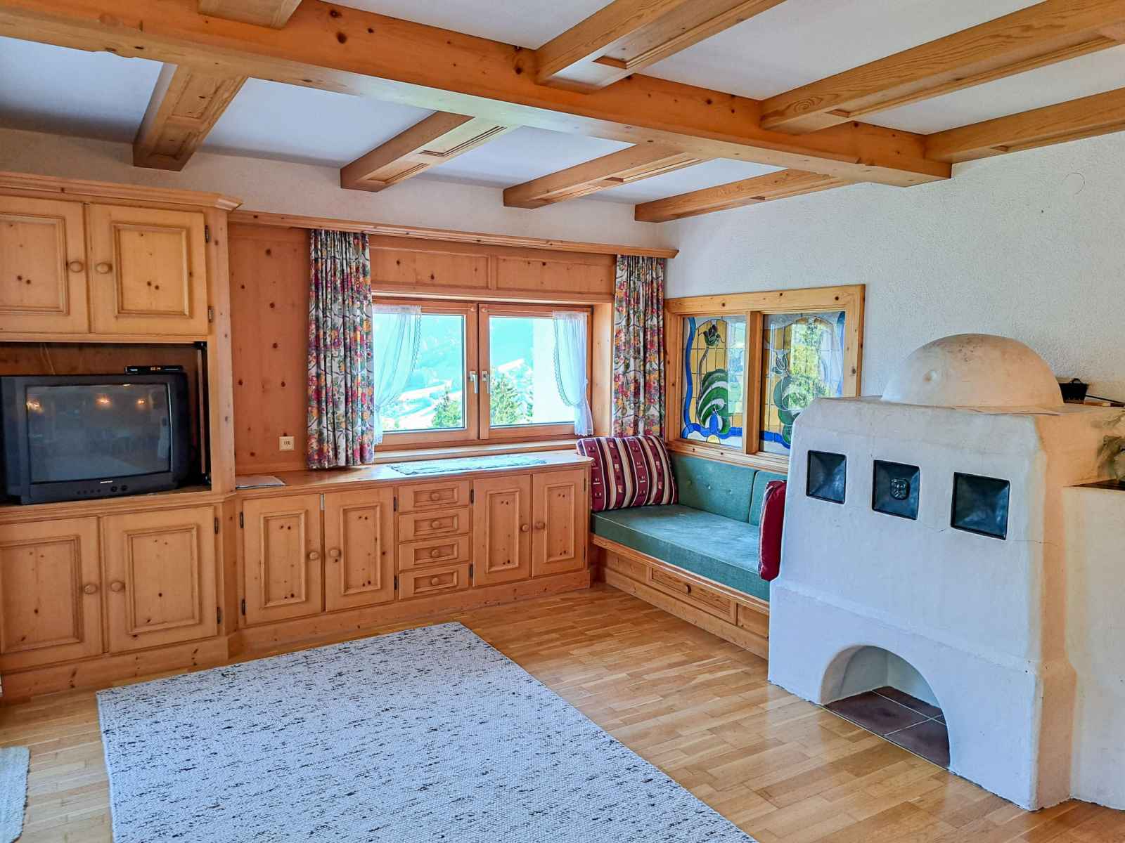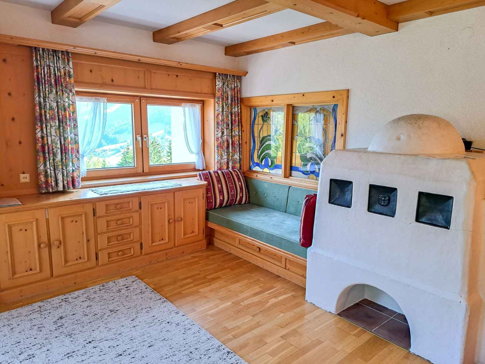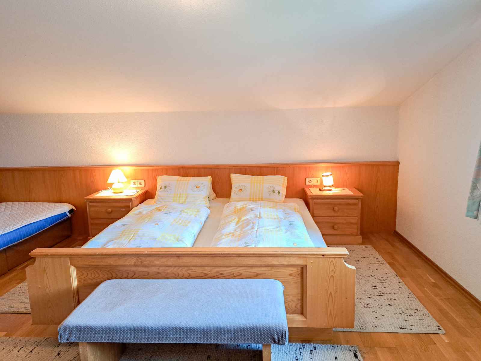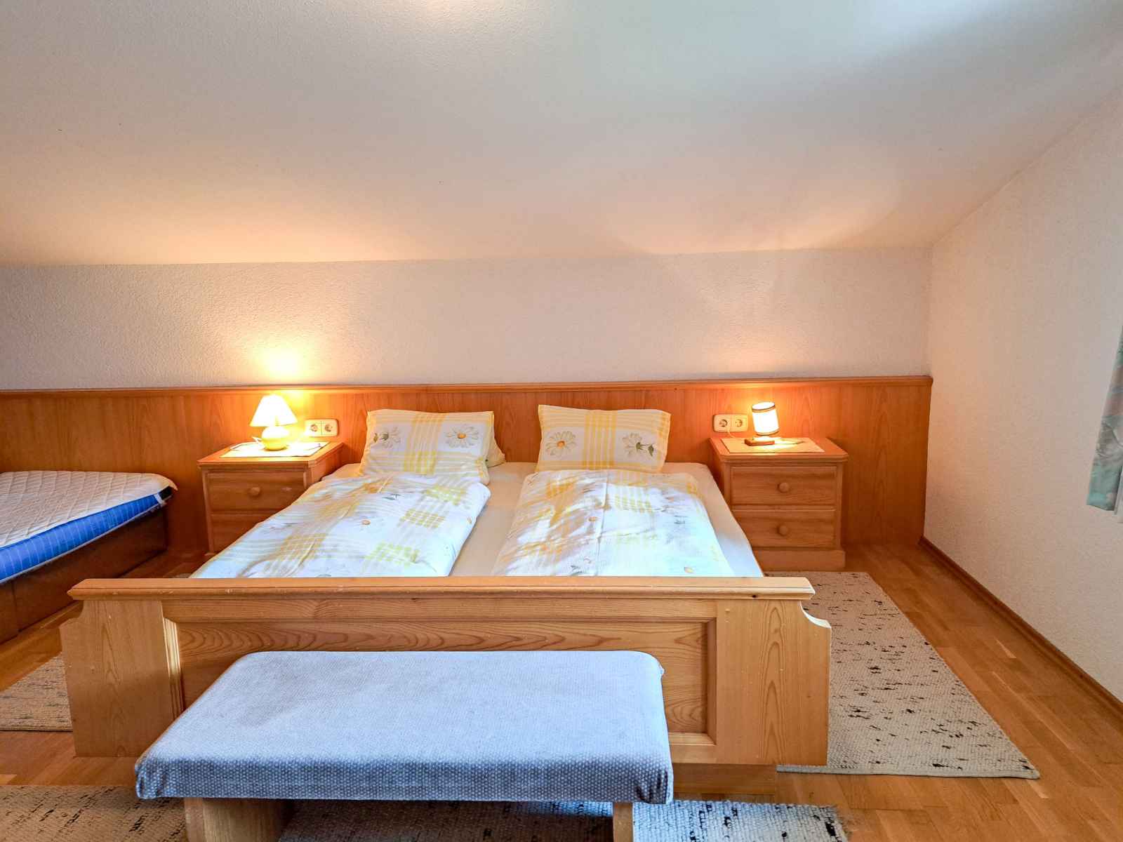 double. Sortie sur le balcon. Cuisine ouverte (four, lave-vaisselle, 4 plaques vitrocéramiques, grille-pain, bouilloire électrique, cafetière électrique) avec coin repas. Sortie sur le balcon. 2ème étage: 1 chambre, mansardée avec 1 lit, 1 lit double et WC séparés. 1 chambre, mansardée avec 2 lits et WC séparés. Bain/douche, double vasque. Chauffage au fuel. Sol en parquet. Balcon. Belle vue sur les montagnes et la vallée. A disposition: chaise haute pour enfant, lit bébé. Veuillez noter: maison non-fumeur. Détecteur de fumée, extincteur.