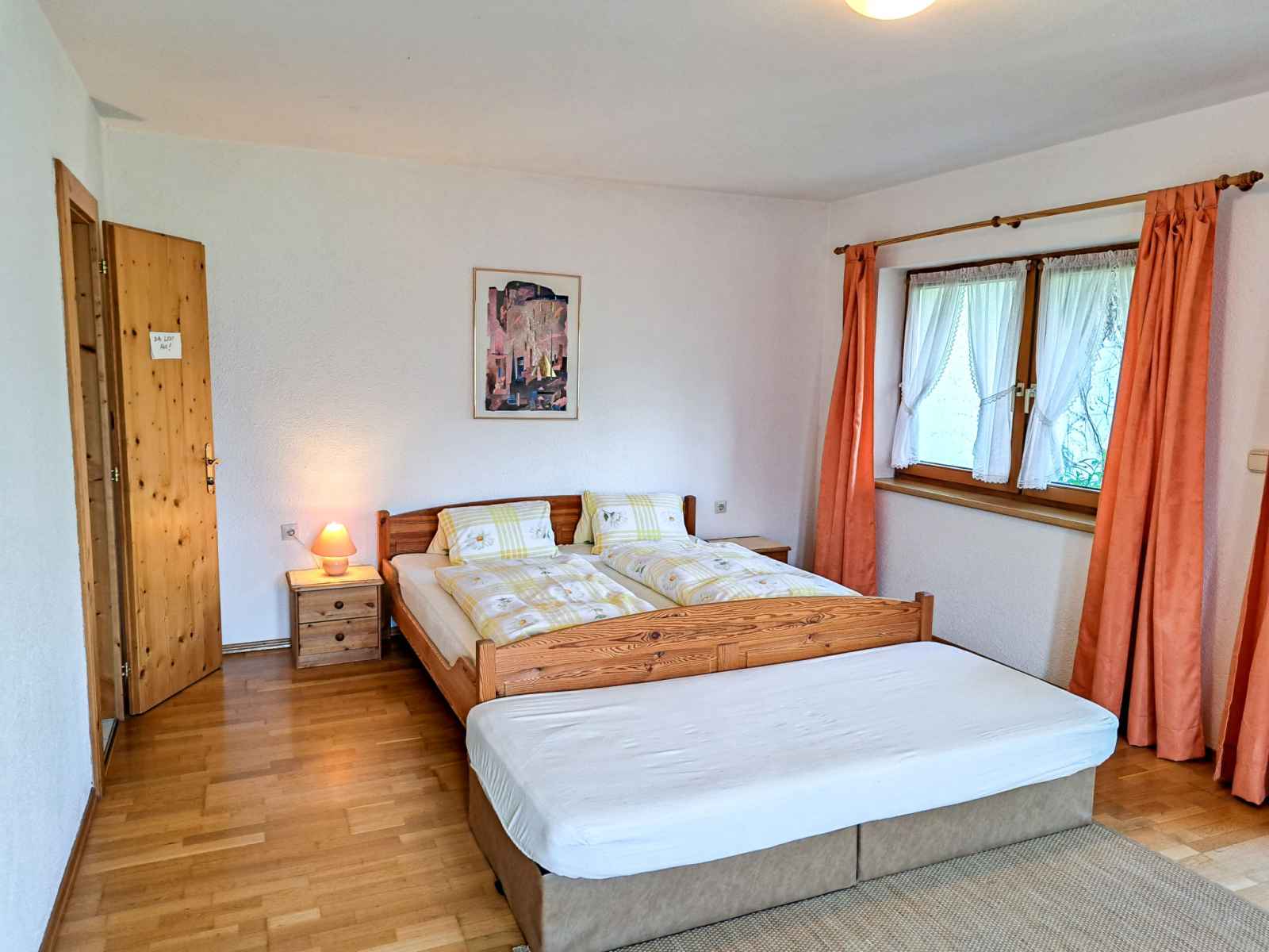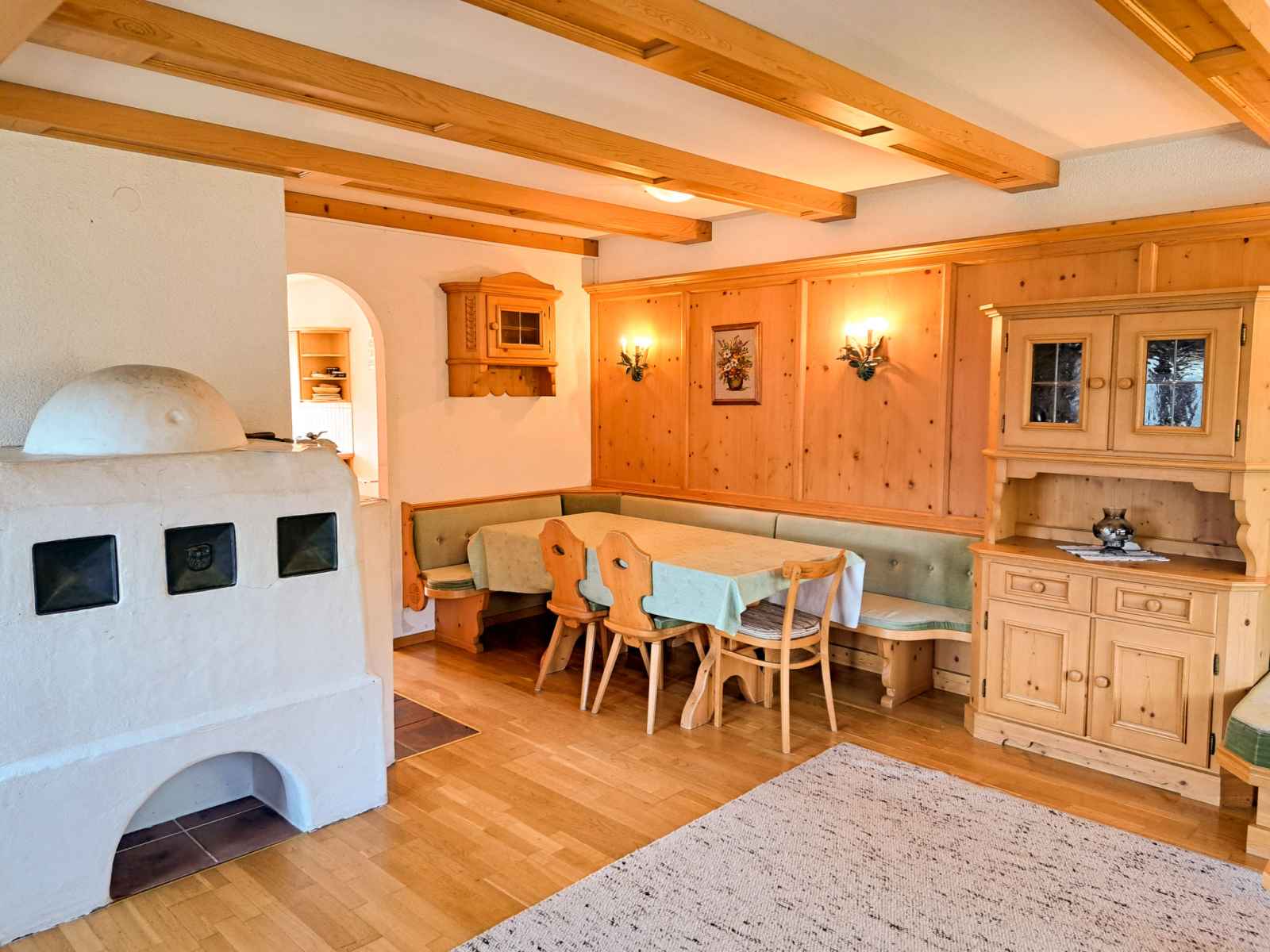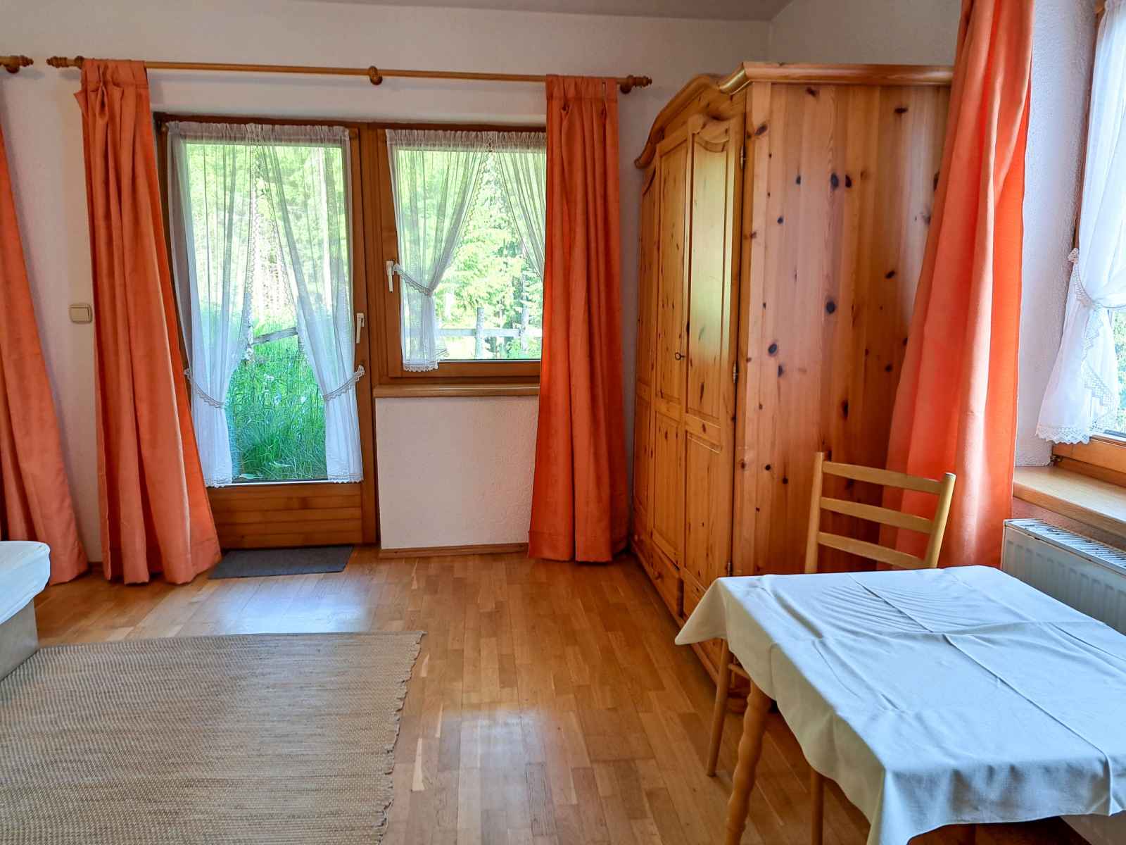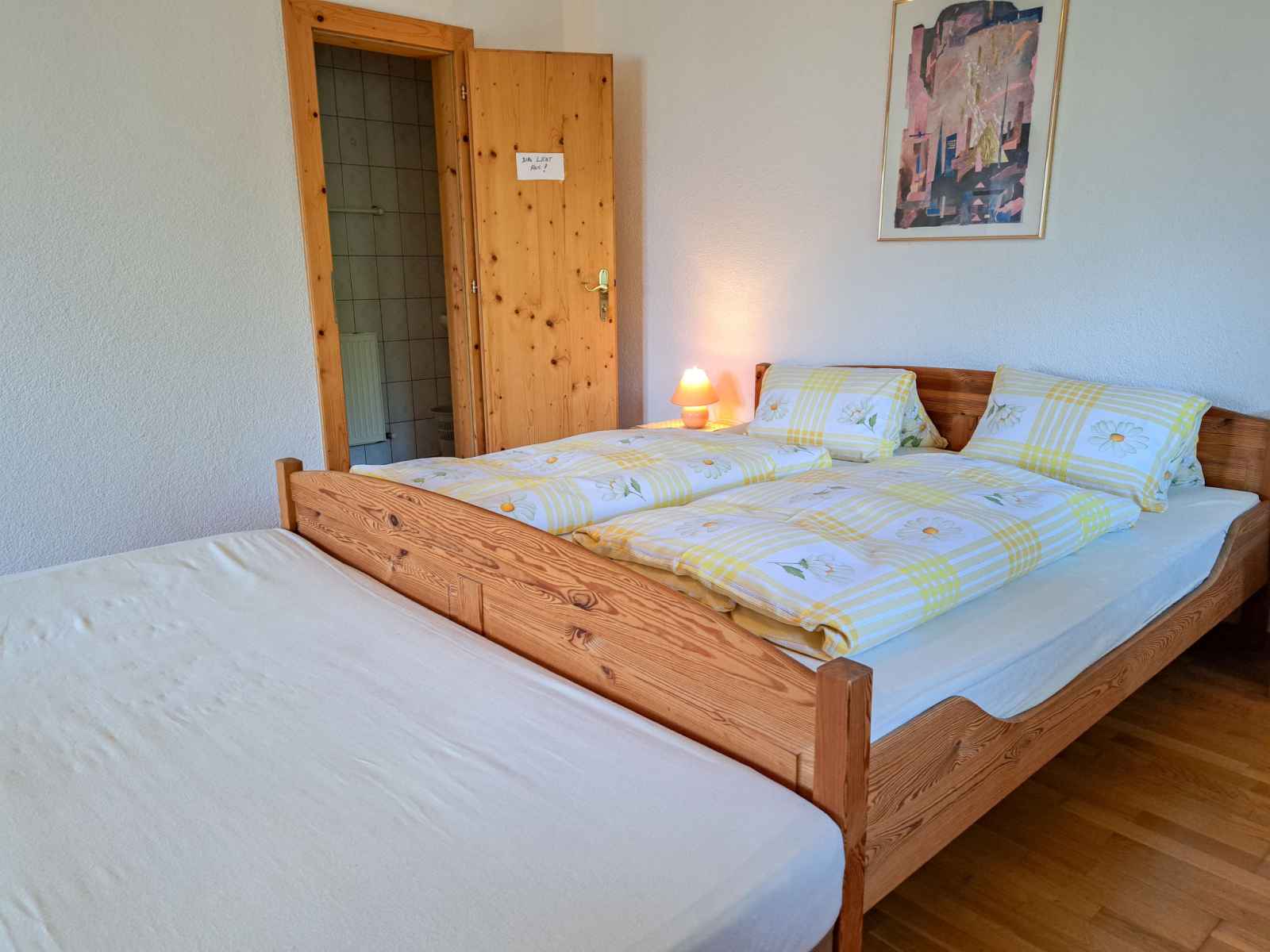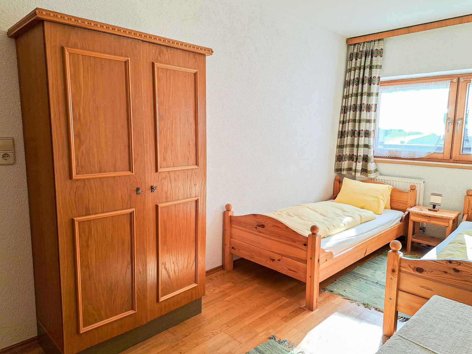 double. Sortie sur le balcon. Cuisine ouverte (four, lave-vaisselle, 4 plaques vitrocéramiques, grille-pain, bouilloire électrique, cafetière électrique) avec coin repas. Sortie sur le balcon. 2ème étage: 1 chambre, mansardée avec 1 lit, 1 lit double et WC séparés. 1 chambre, mansardée avec 2 lits et WC séparés. Bain/douche, double vasque. Chauffage au fuel. Sol en parquet. Balcon. Belle vue sur les montagnes et la vallée. A disposition: chaise haute pour enfant, lit bébé. Veuillez noter: maison non-fumeur. Détecteur de fumée, extincteur.