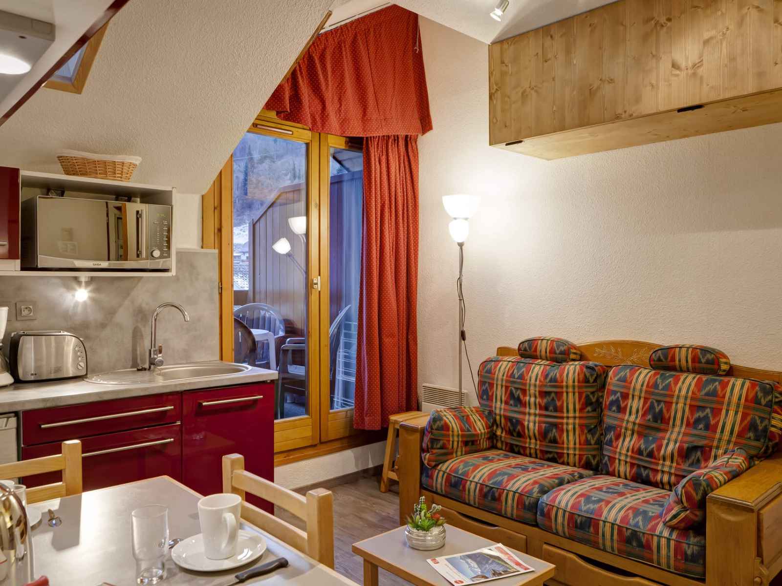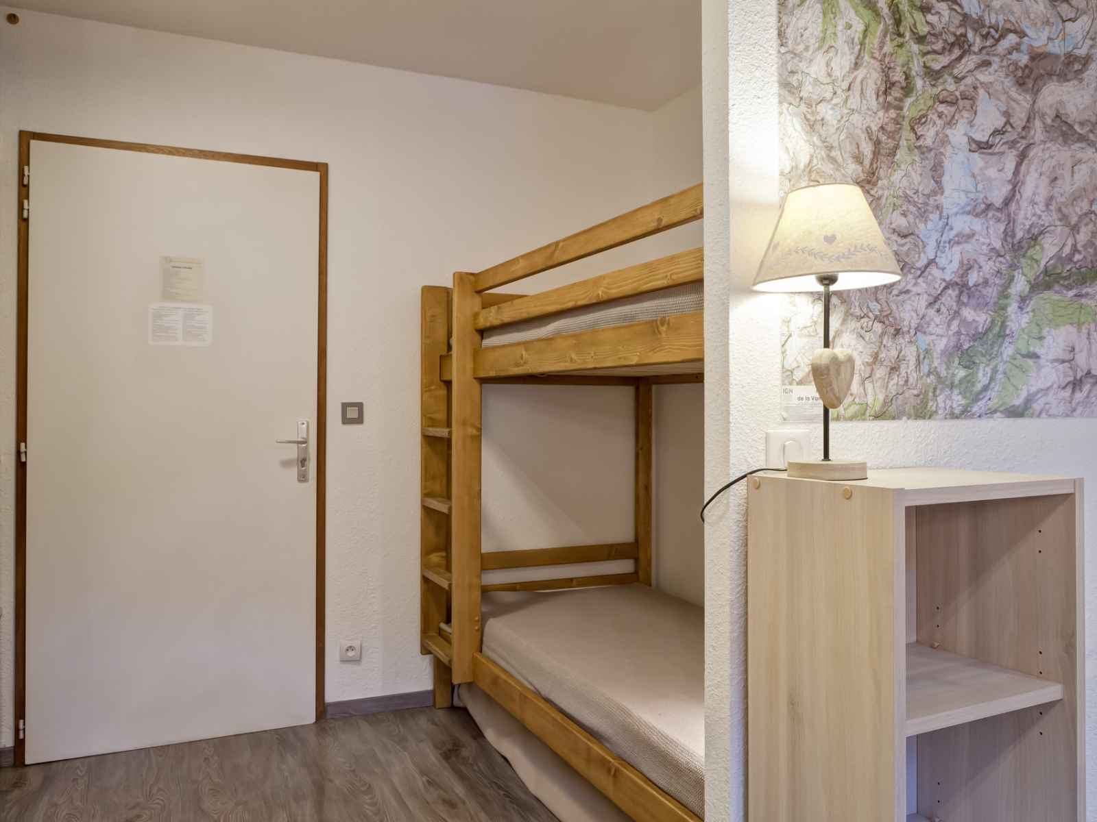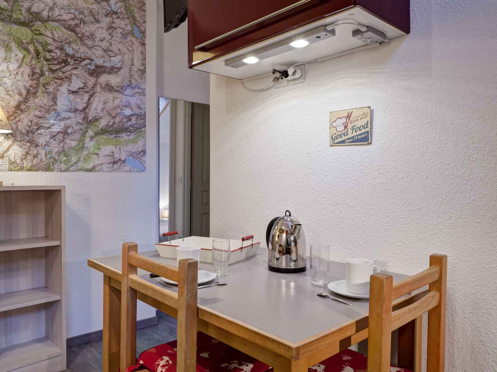 cuisine équipé avec : plaques électriques, hotte de cuisson, micro-ondes, lave-vaisselle, réfrigérateur avec freezer, cafetière, bouilloire et grille-pain. COUCHAGES : - Chambre avec fenêtre de toit : un lit double en 140 cm (2 personnes). - Coin montagne : un ensemble de lits superposés (2 personnes). Salle d'eau avec douche et toilettes. Lave-linge. Accès internet WIFI inclus. Casier à skis. Place de parking couverte incluse dans la location. CONDITIONS DE LOCATION : Linge de lit inclus du 15/12 au 15/04 pour les courts séjours d'hiver. Le linge de lit n'est pas inclus pour les séjours de cures toute l'année. Linge de toilette et ménage de fin de séjour non inclus et sur demande. Caution demandée à l'arrivée. Animaux non autorisés. INTERDICTION DE FUMER DANS LE LOGEMENT