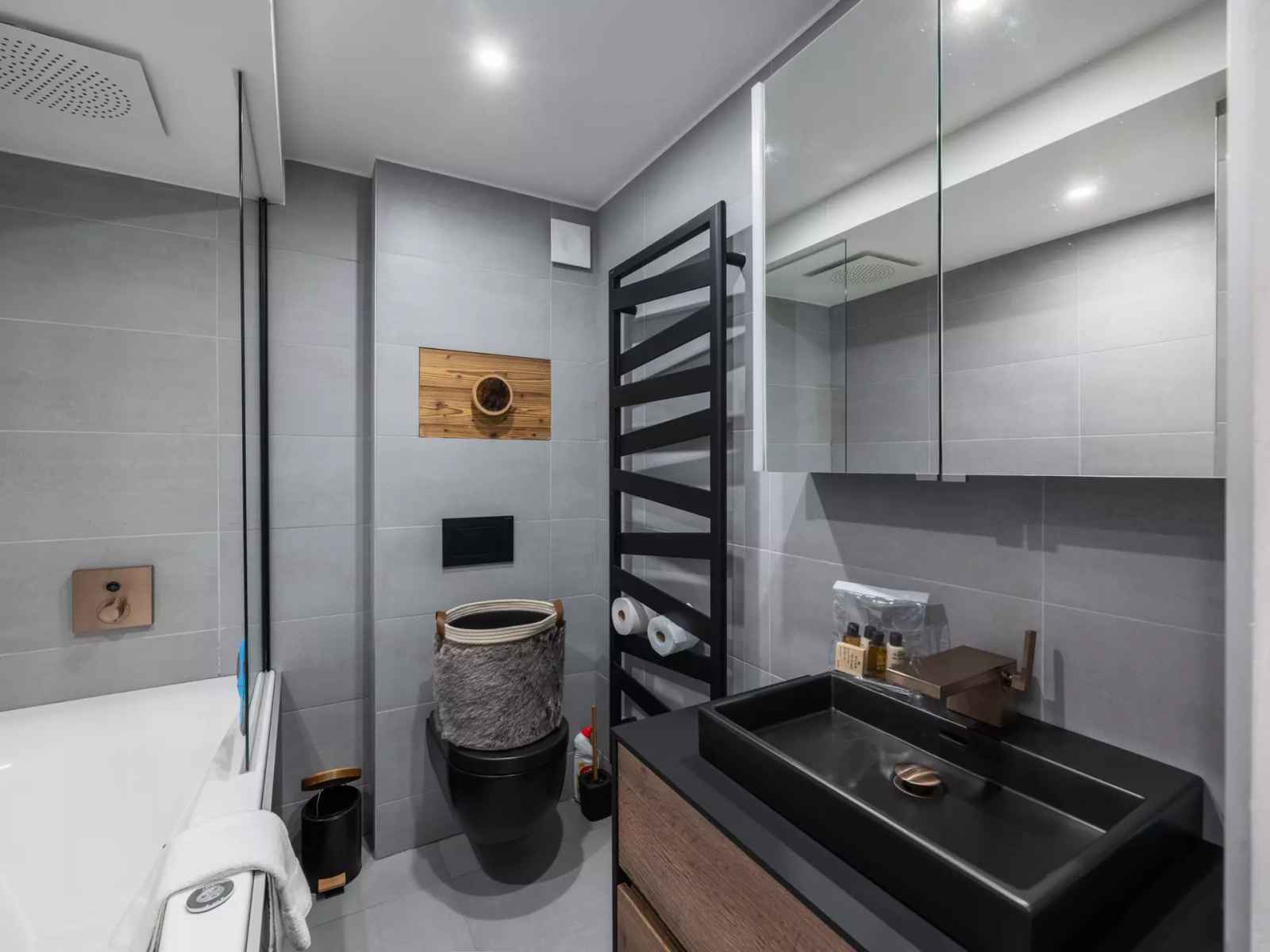 - Salle de bain indépante avec baignoire, simple vasque, sèche-serviettes, WC