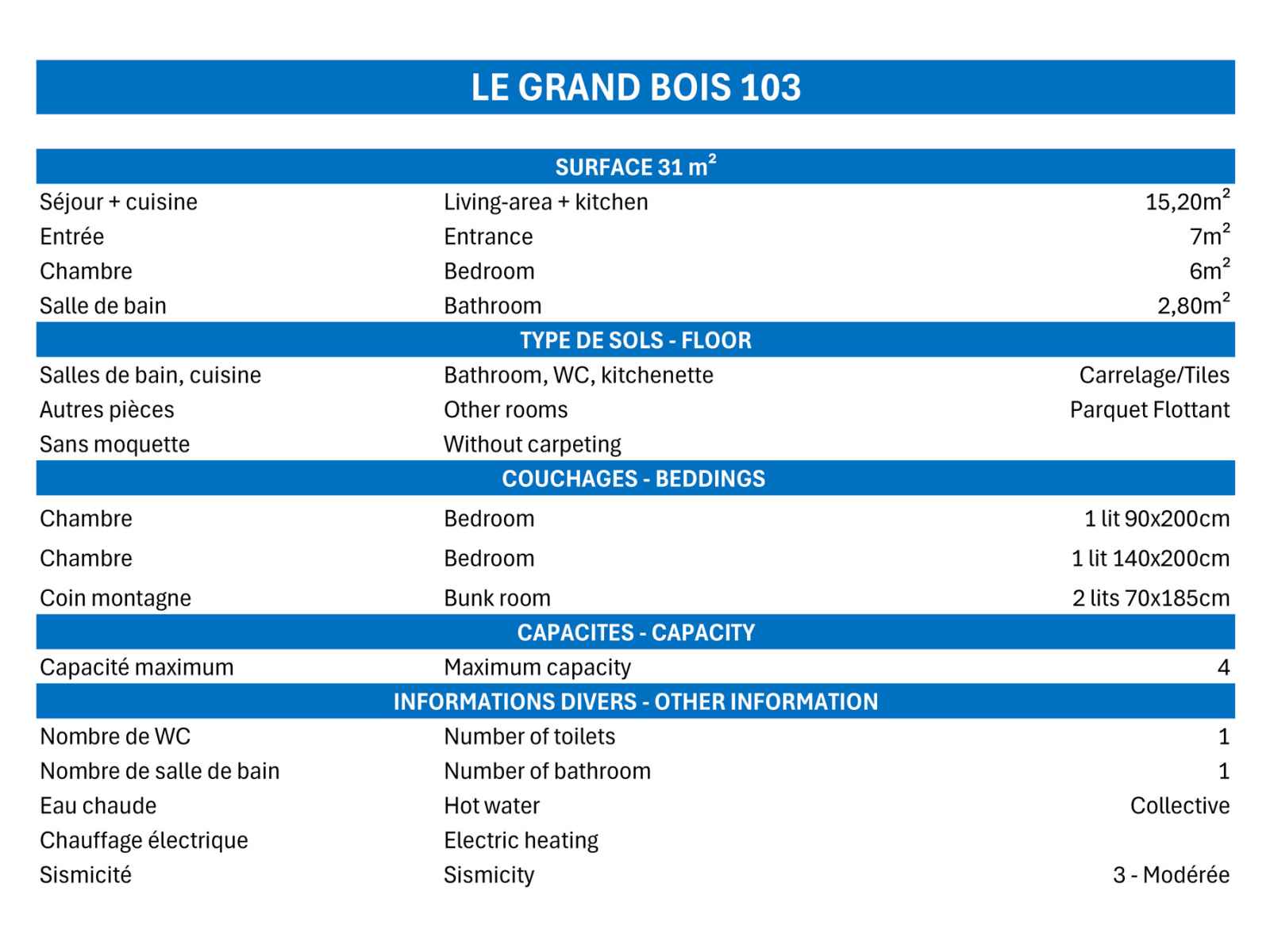 - Caution 350 € (CB ou chèque détruit au plus tard 14 jours après votre départ)