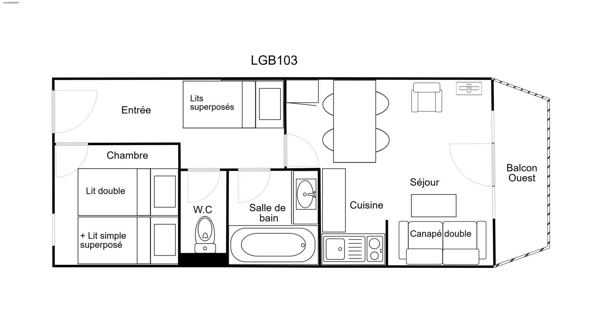 chambre : 1 lit double (140x200cm) et 1 lit simple superposé (90x200cm)