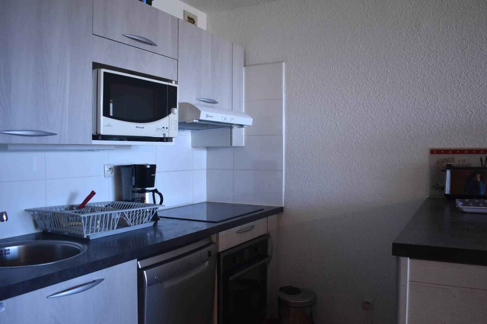Coin cuisine équipé : 2 plaques électriques, four, réfrigérateur, micro-ondes.