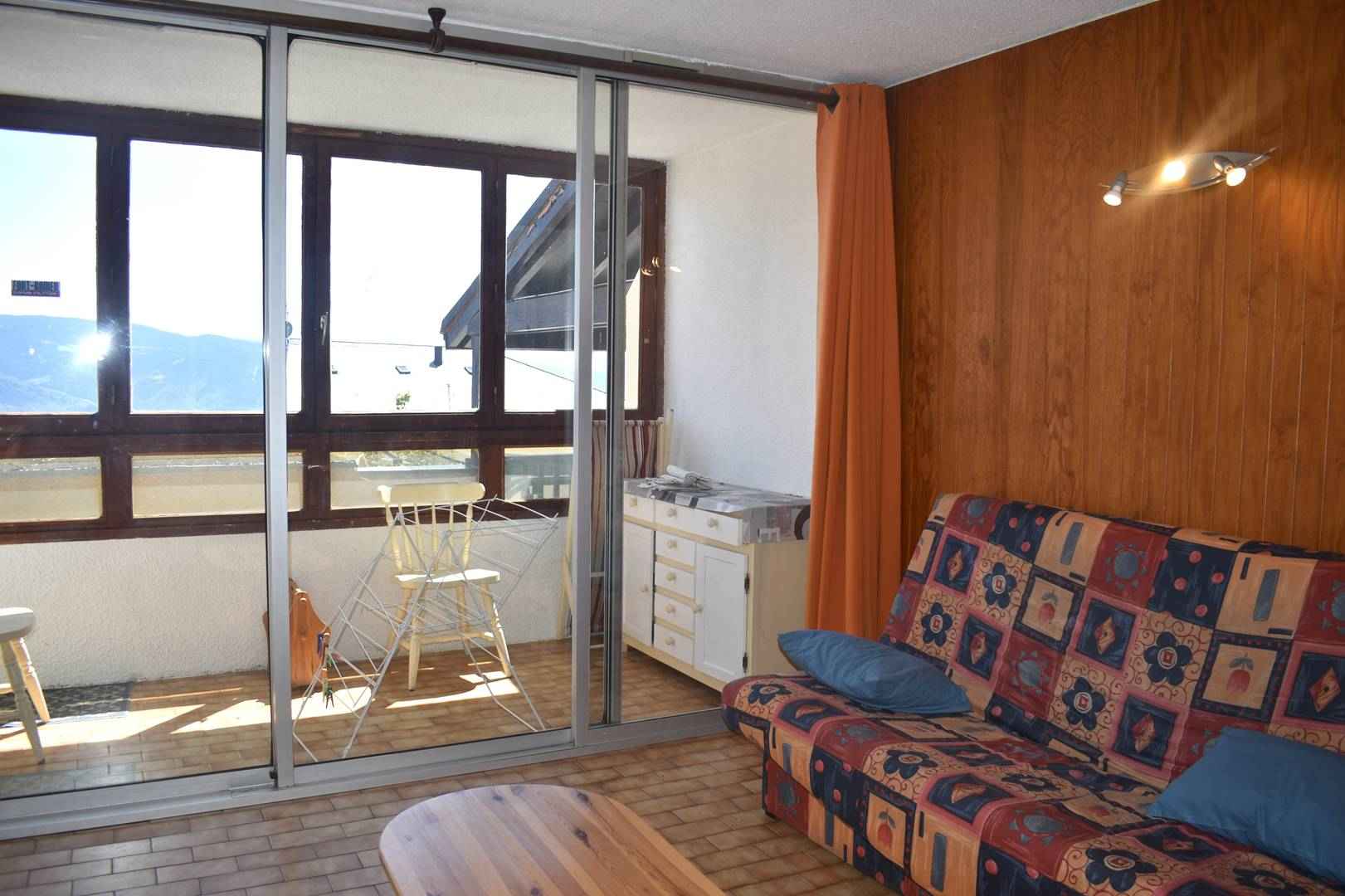 Séjour lumineux avec loggia vitrée, canapé-lit (2 places) et vue panoramique.