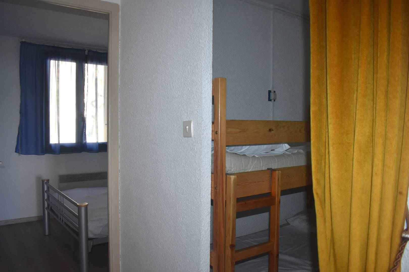 Cabine fermée par un rideau : Lits superposés.