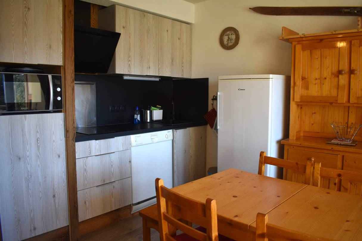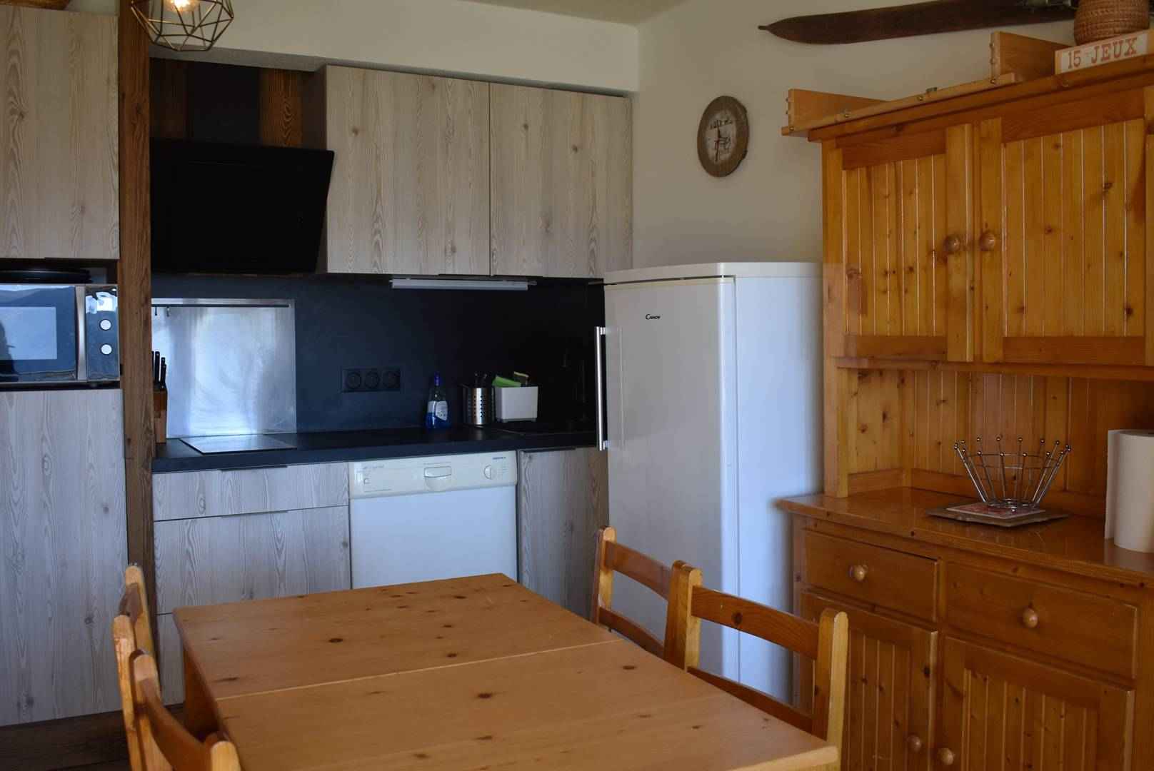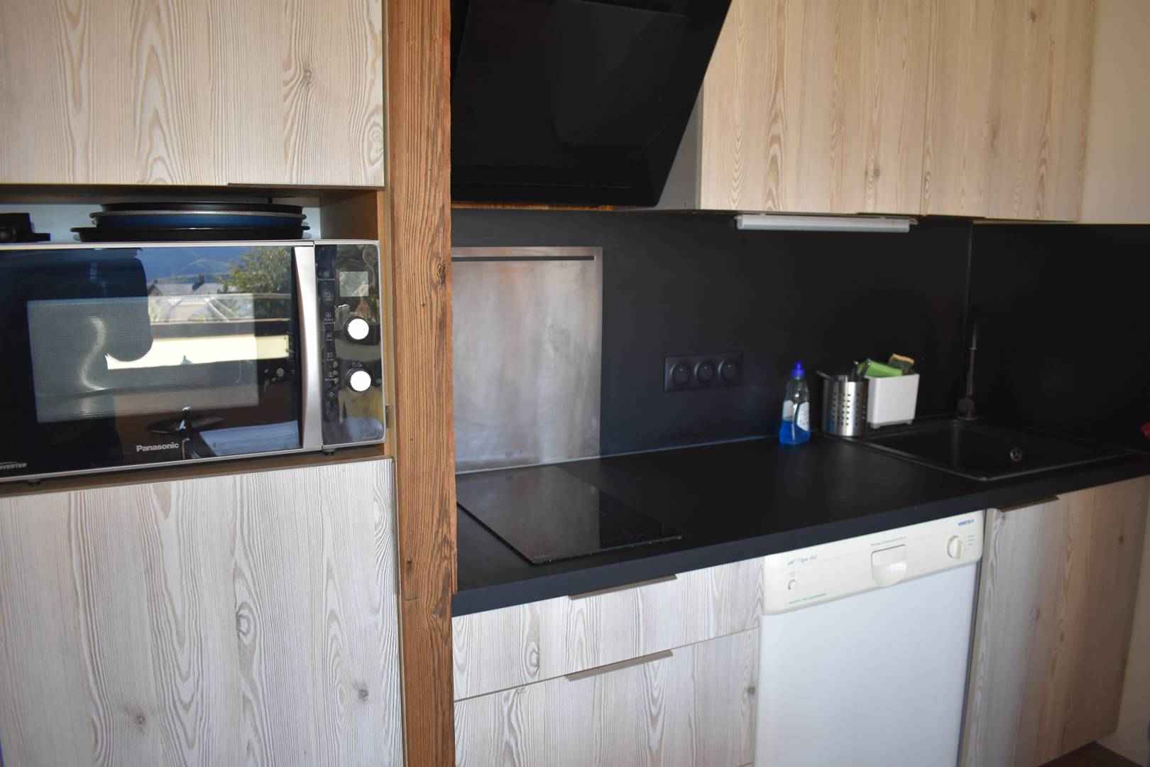 - Cuisine ouverte (Cuisine ouverte sur le séjour composé d'un micro-onde, d'un lave-vaisselle, d'un frigo et de deux plaques en vitrocéramique)