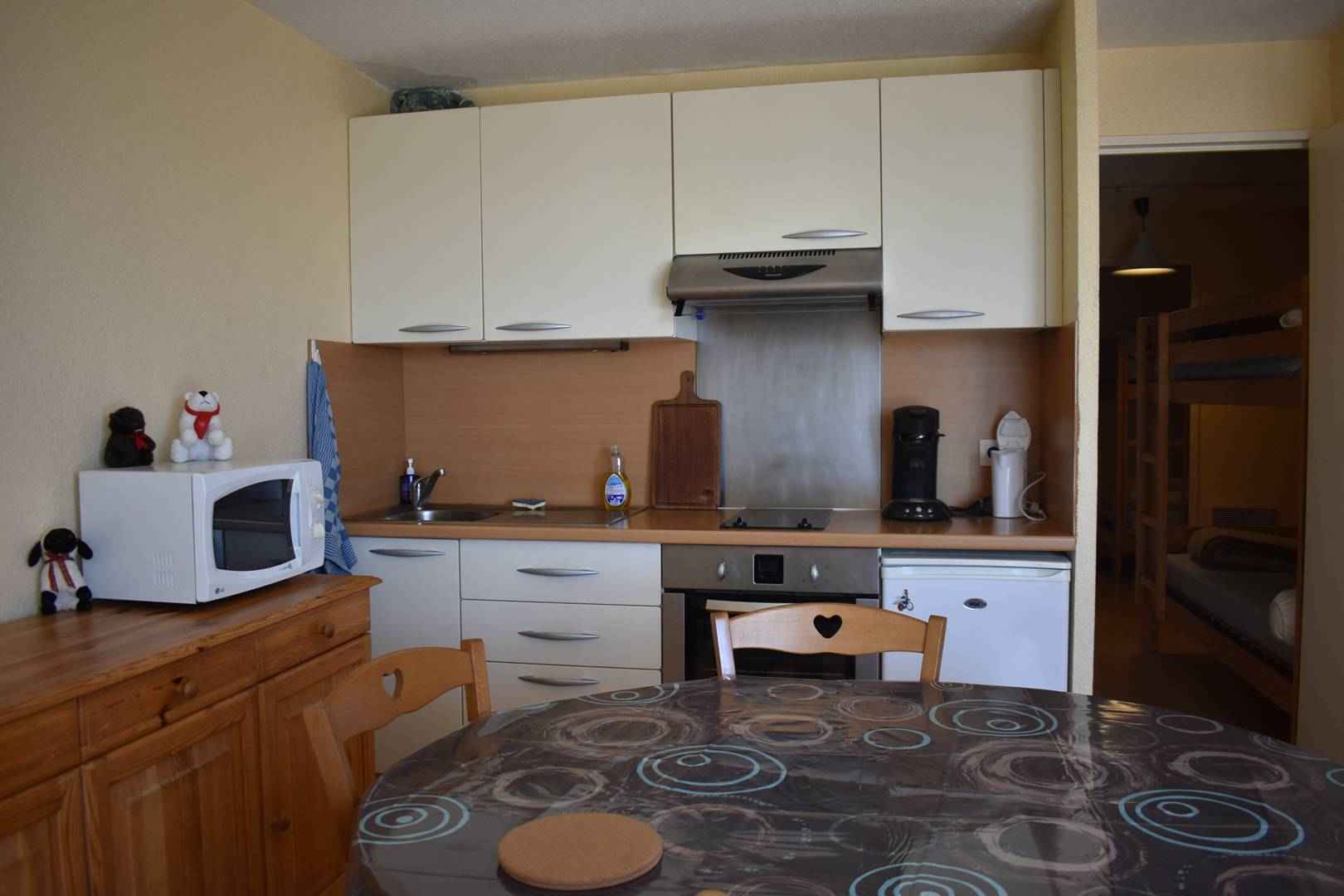 -Une cuisine ouverte et entièrement équipée : four, micro-ondes, réfrigérateur top, évier inox, cafetière Senseo, bouilloire.