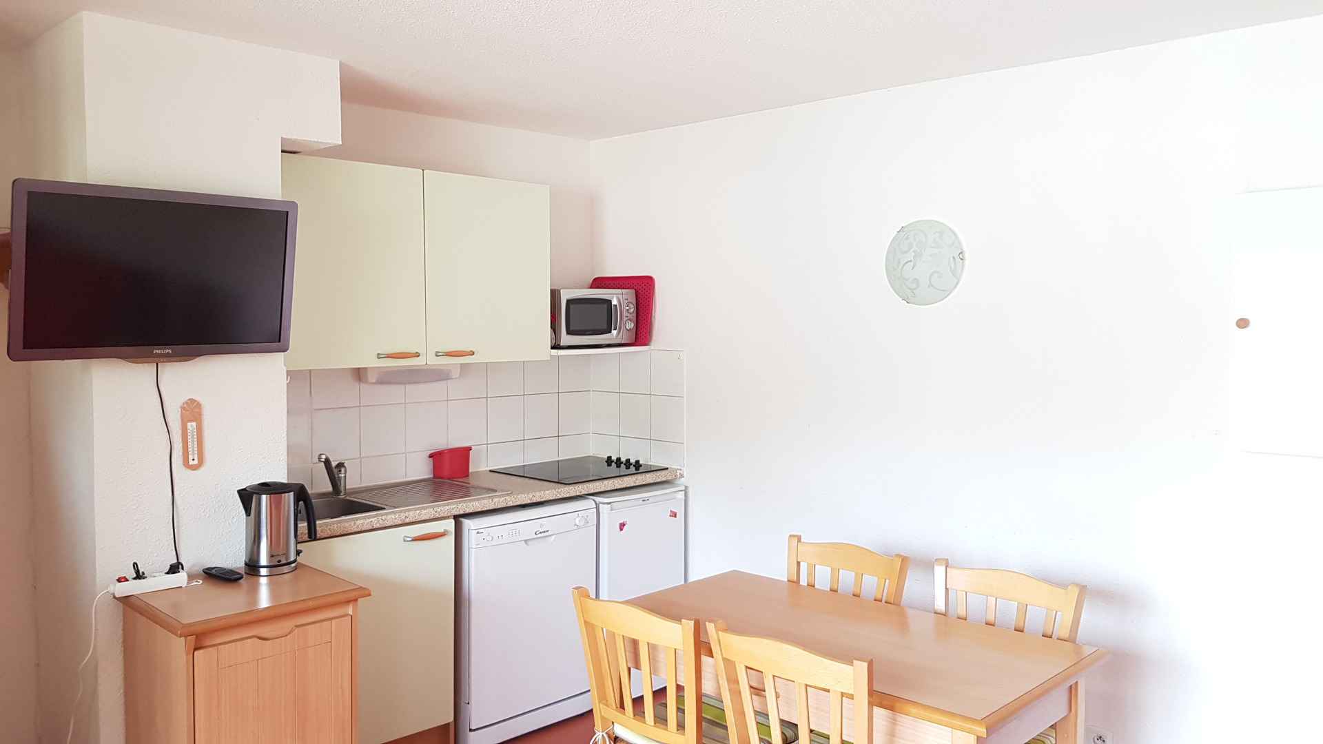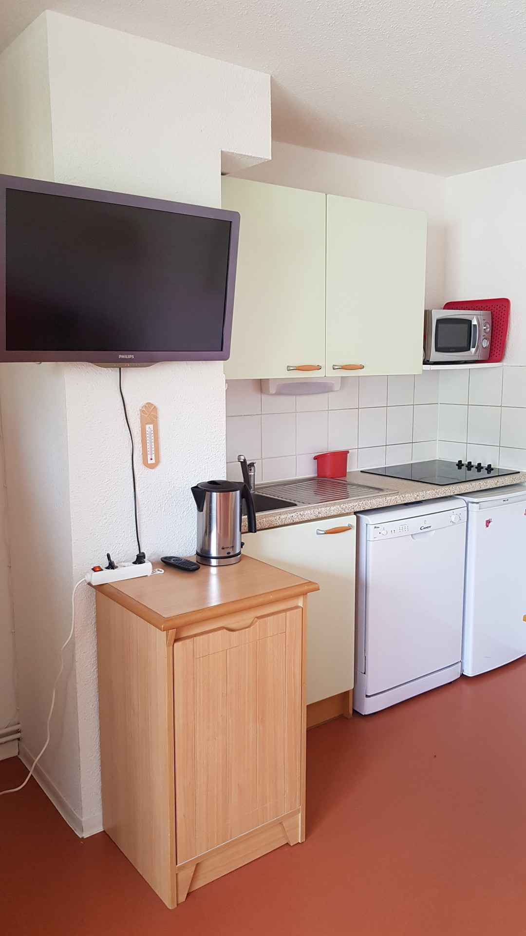 coin cuisine équipé avec plaques vitro-céramiques, micro-ondes, lave-vaisselle, cafetière à filtre, bouilloire, nécessaire de vaisselle. balcon. local à skis. parking gratuit.