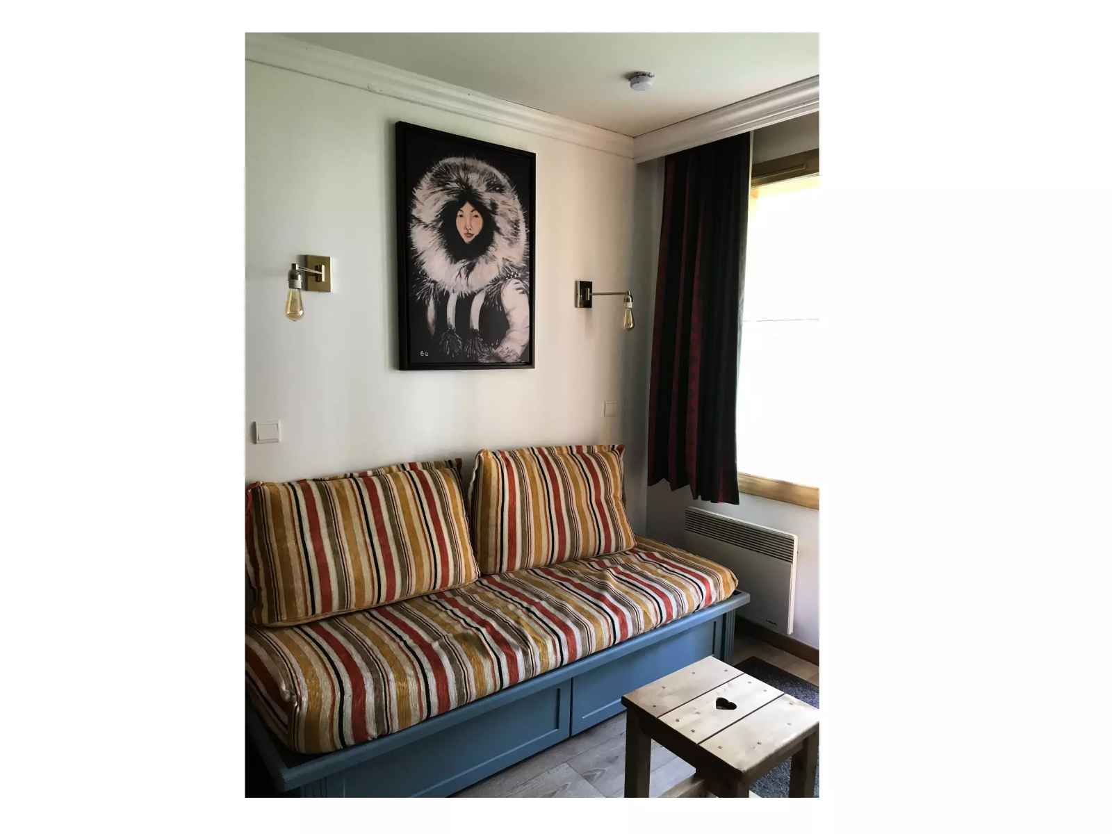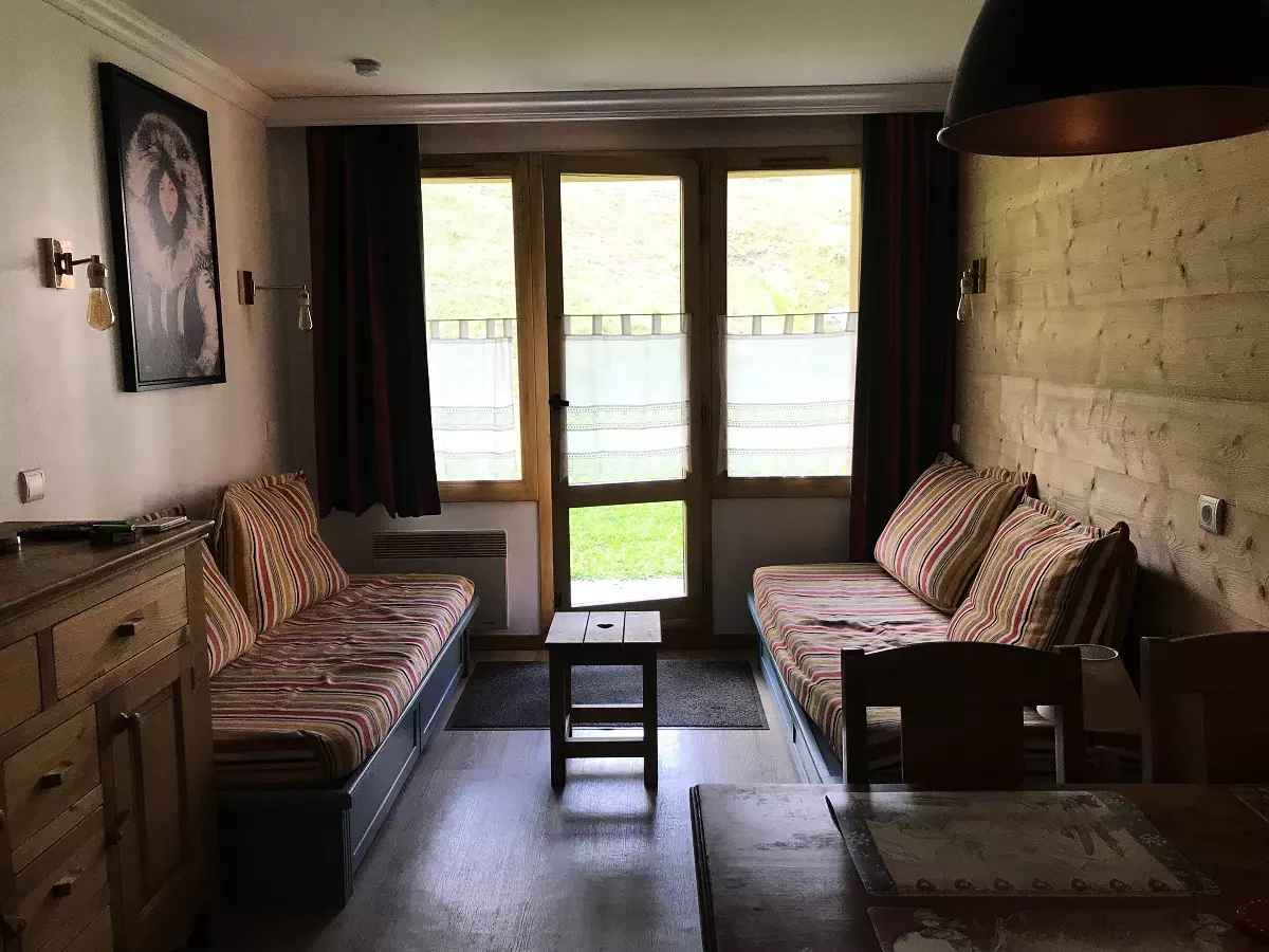 Équipements séjour : 2 lits banquettes dont 1 avec lit gigogne (3 couchages). côté repas : une table avec 4 chaises.