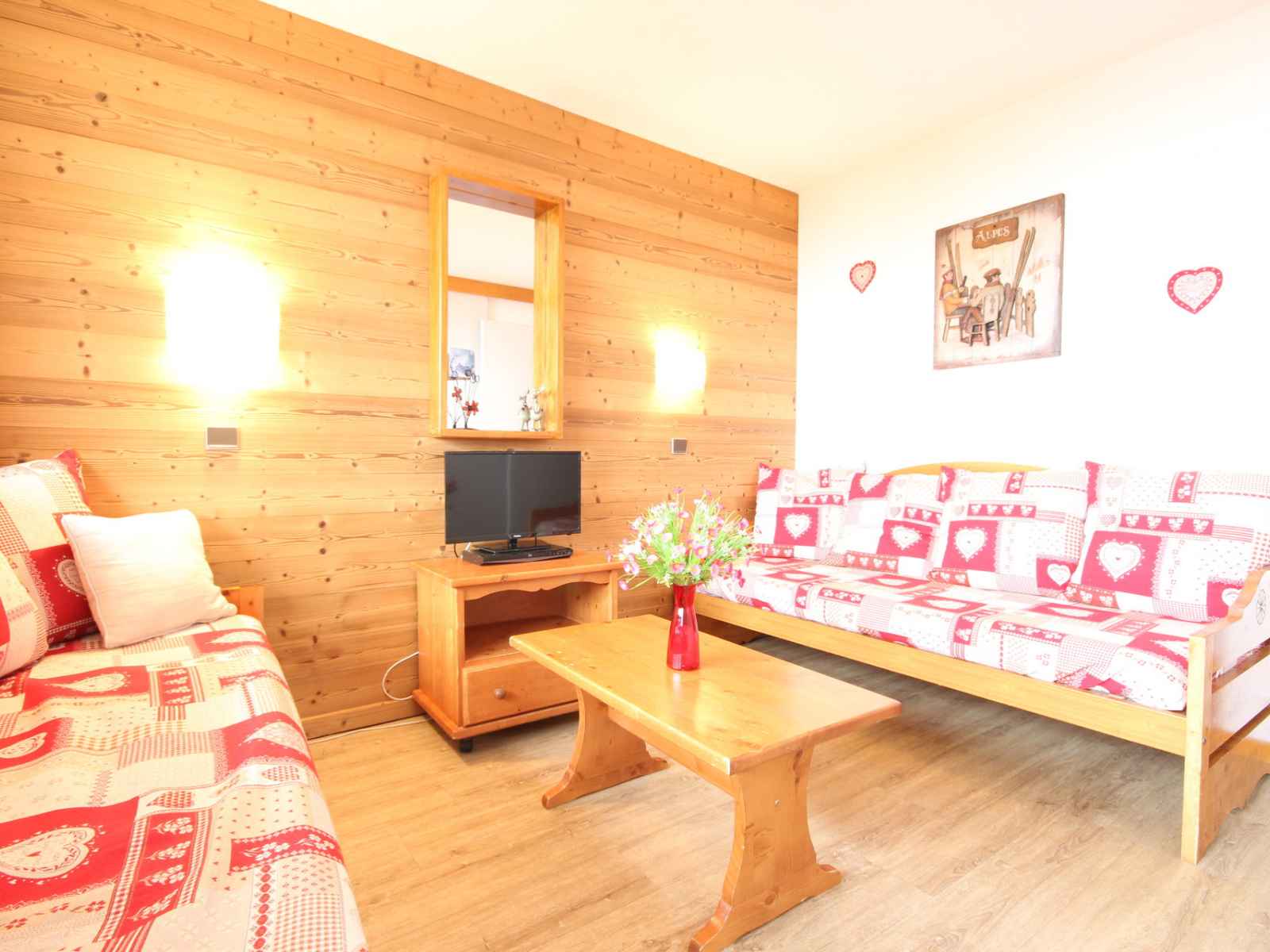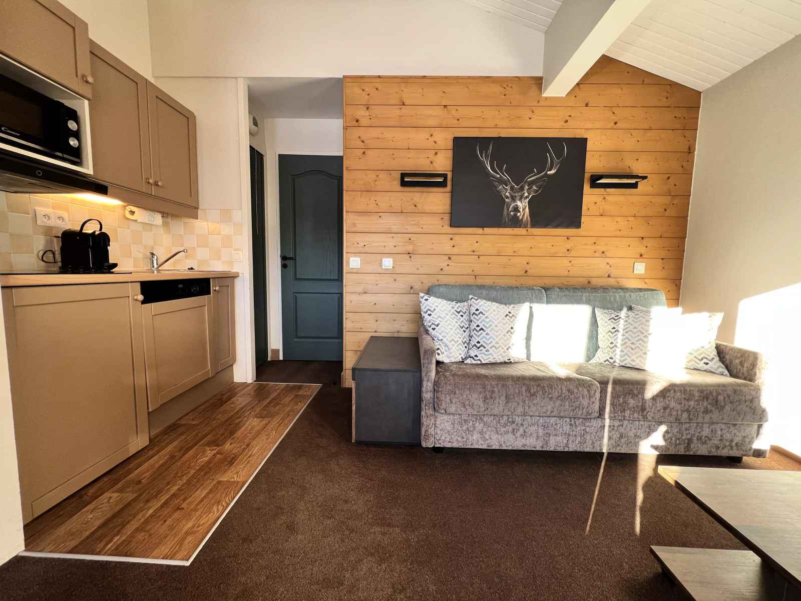 plaques électriques, four combiné micro-ondes, lave-vaisselle, lave linge, cafetière, grille-pain), d'une belle salle de douche rénovée d'un WC séparé. Vous disposez également d'une chambre avec deux lits simples, d'un coin salon équipé d'un lit gigogne et d'un lit banquette pour une personne, d'un coin salle à manger équipé d'un lit rabattable d'une personne. Pour votre confort vous disposez d'une télévision. Casier à skis à votre disposition. Ses atouts : - Appartement avec belle superficie - Petite cuisine indépendante - Balcon double exposition - Couettes Linge et ménage de fin de séjour en suppléments. Animaux refusés. Appartement non fumeur