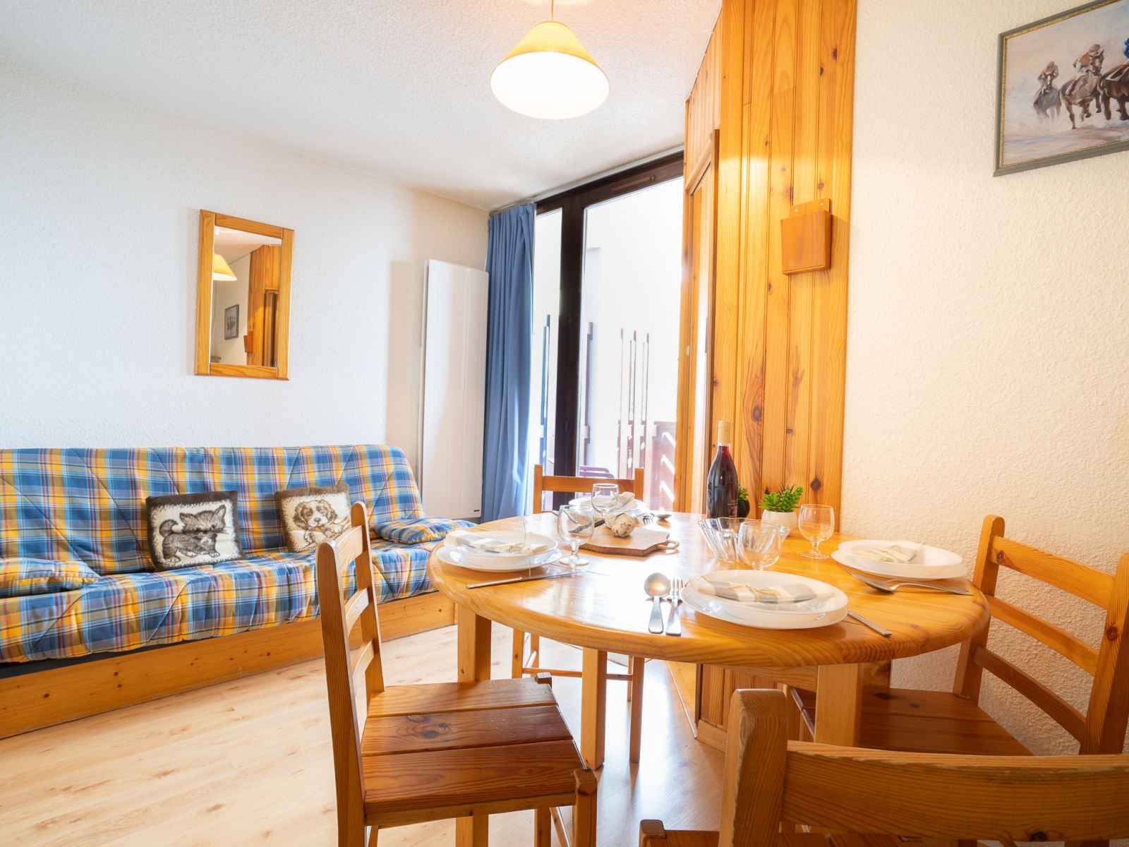 Apt 2 pièces 25 m2 au 1er étage. aménagement agréable: petit séjour/salle à manger avec tv (écran plat). sortie sur la terrasse. entrée avec 1 x 2 lits superposés (70 cm, longueur 190 cm). 1 chambre avec 1 grand-lit (140 cm, longueur 190 cm). coin cuisine (2 plaques de cuisson, mini-four, grille-pain, bouilloire électrique, micro-ondes,