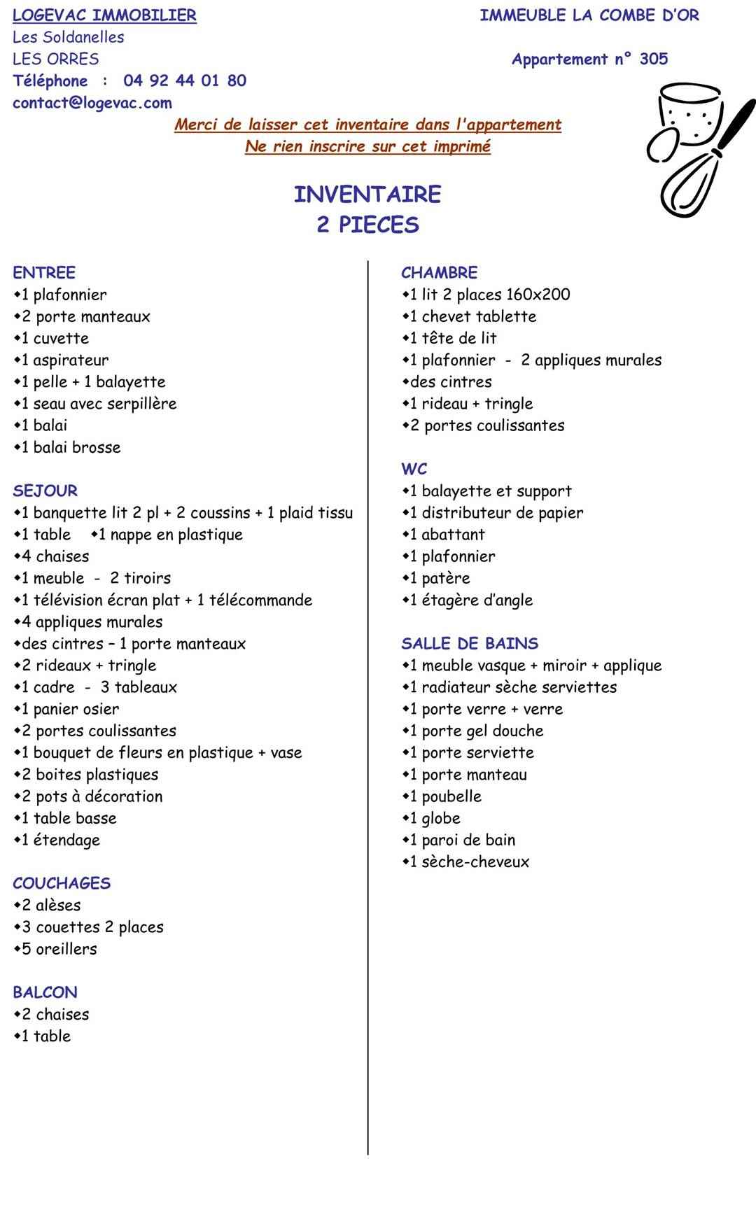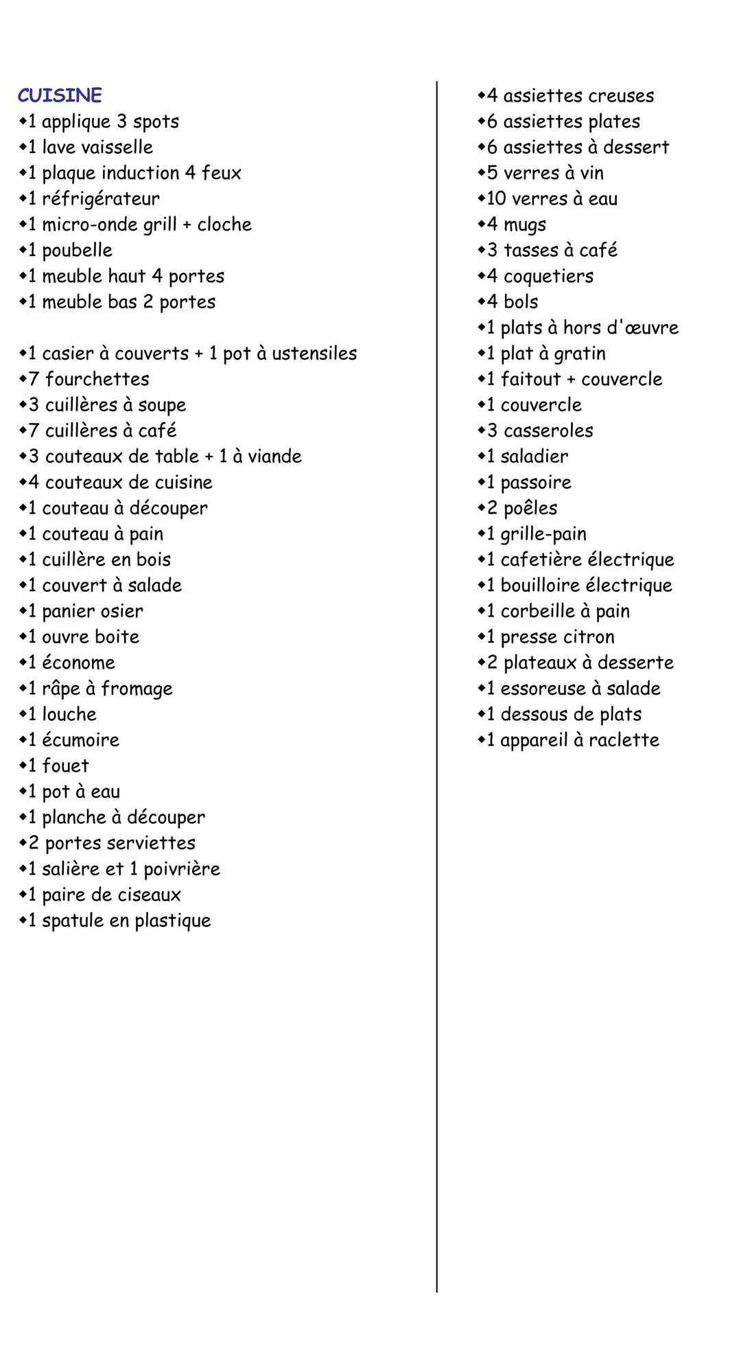 • Equipements : Lave vaisselle, Micro onde, Télévision
