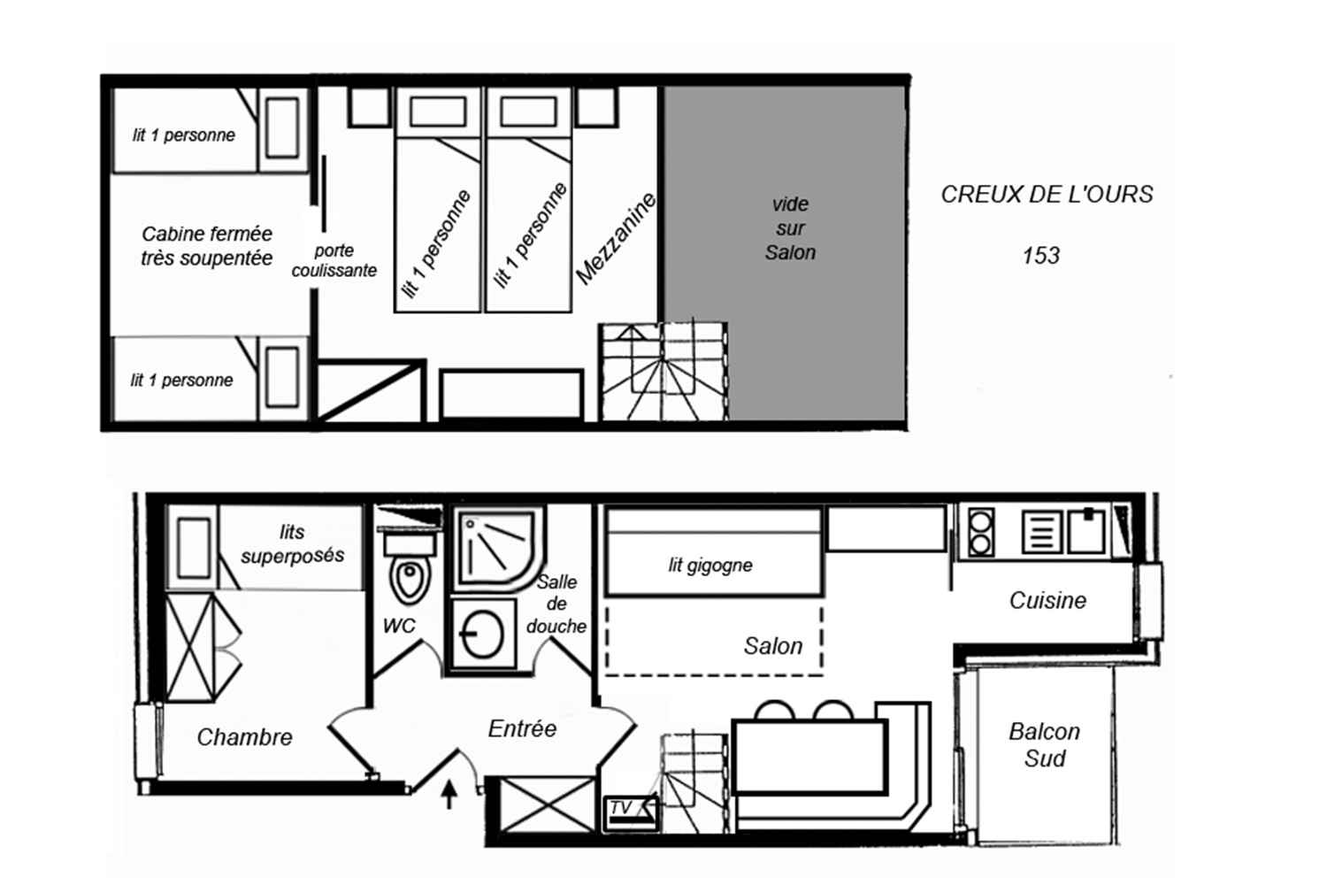 2 pièces mezzanine (soupentée), 6 personnes, 34m², balcon sud, 3ème etage