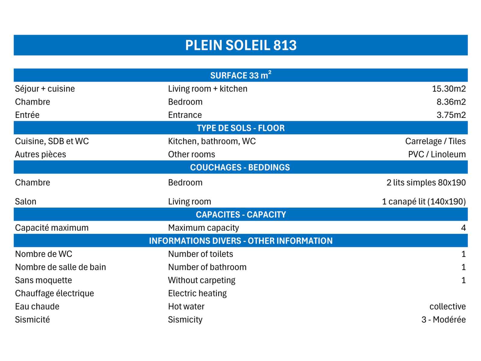 - Caution 350 € (CB ou chèque détruit au plus tard 14 jours après votre départ)