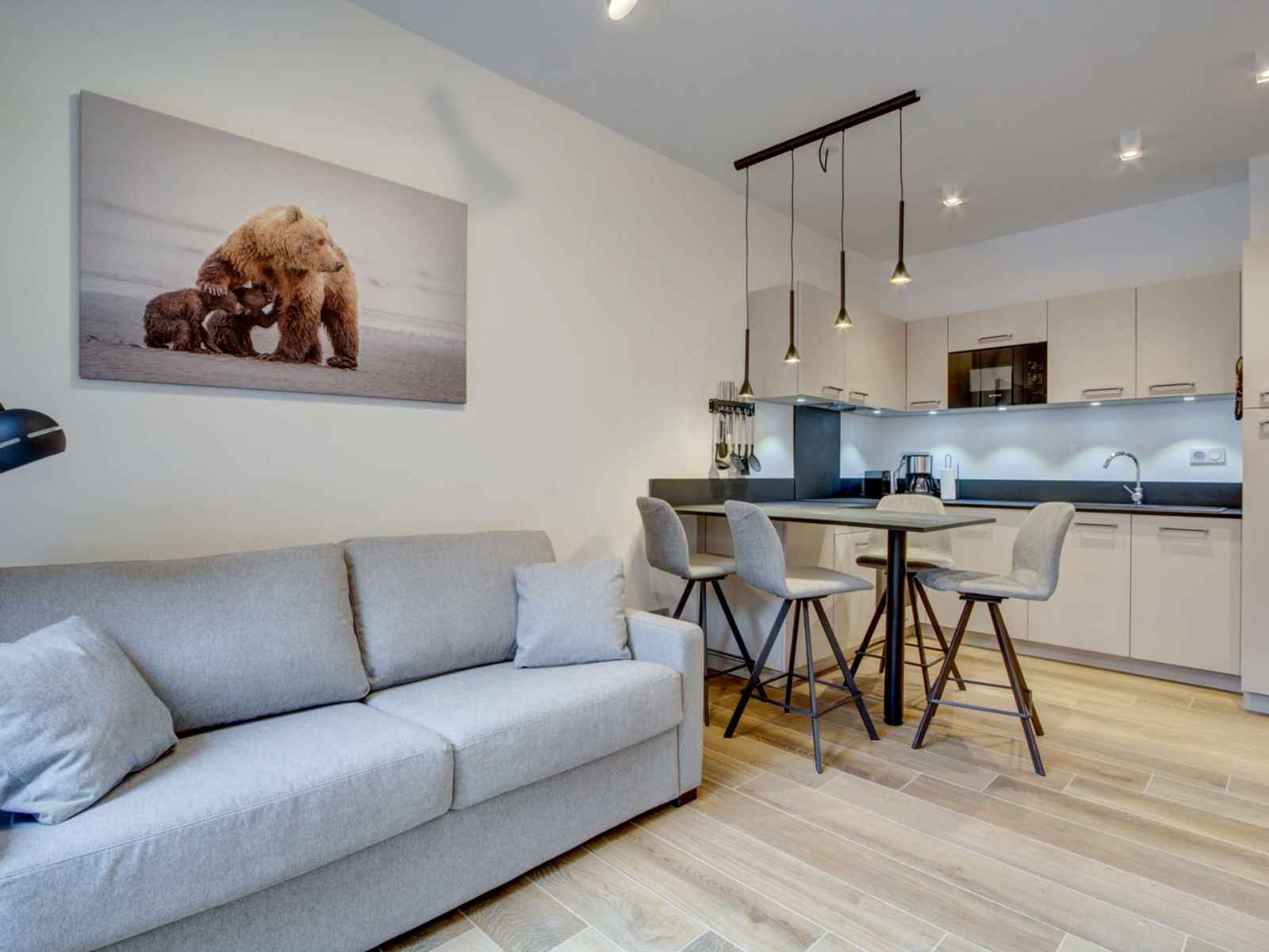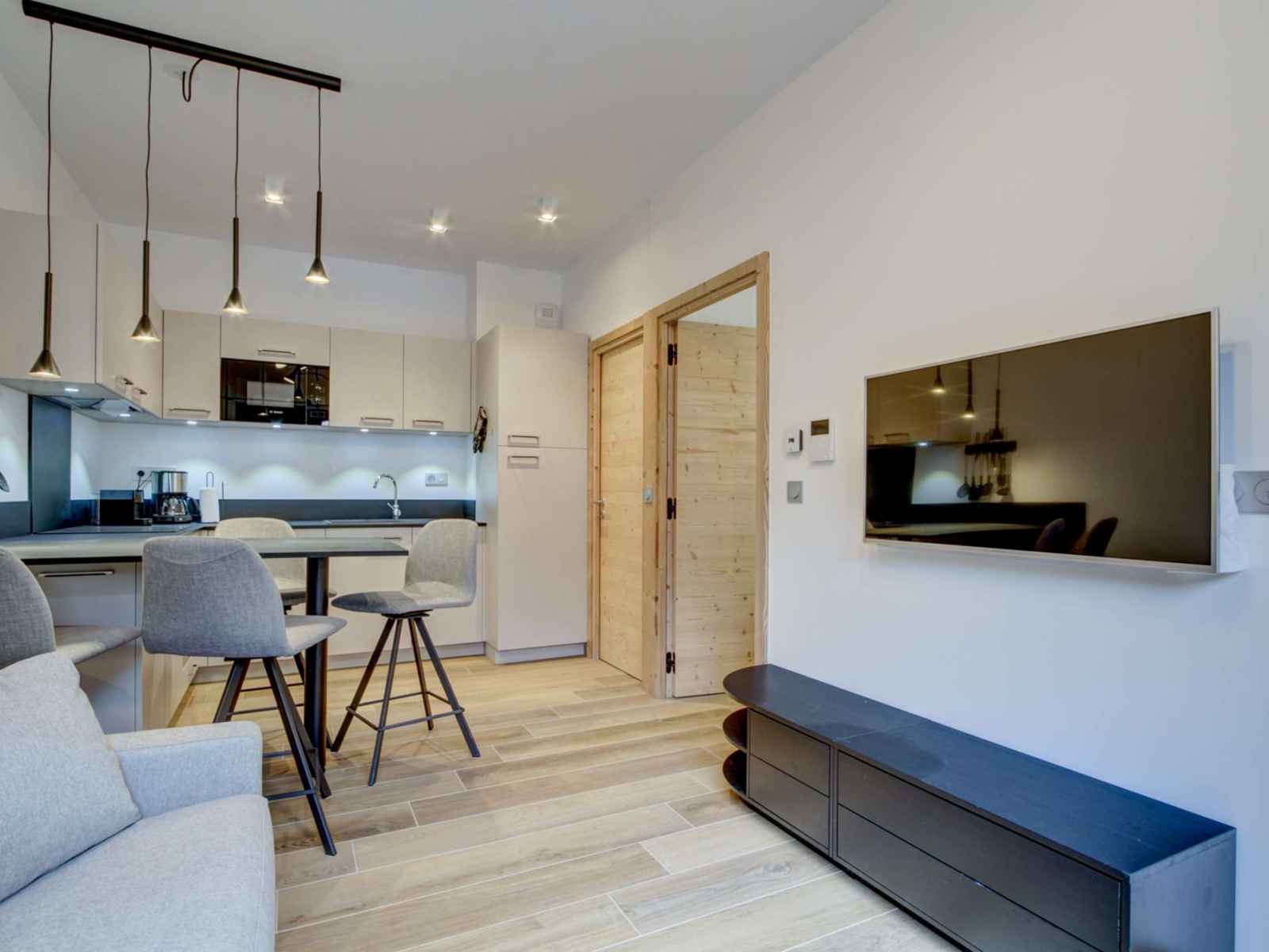 pièce à vivre avec cuisine équipée ouverte sur le séjour avec coin