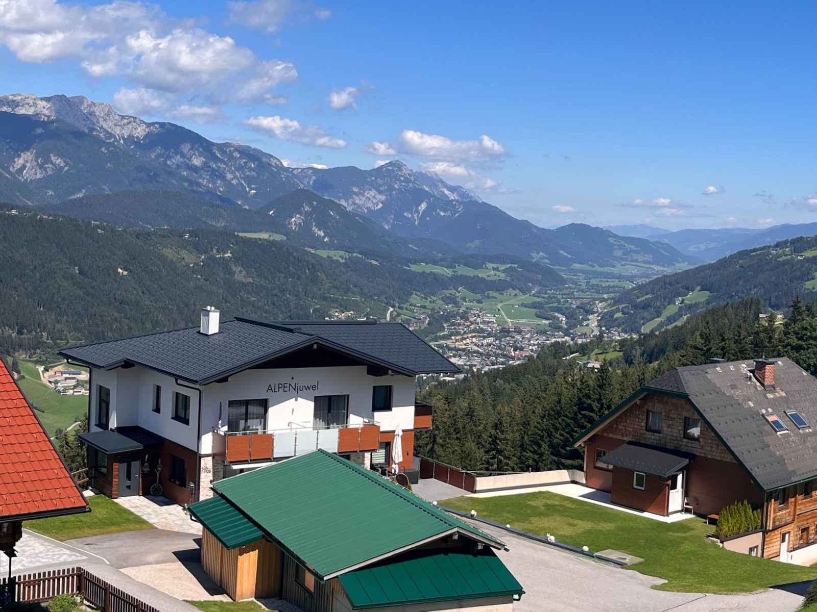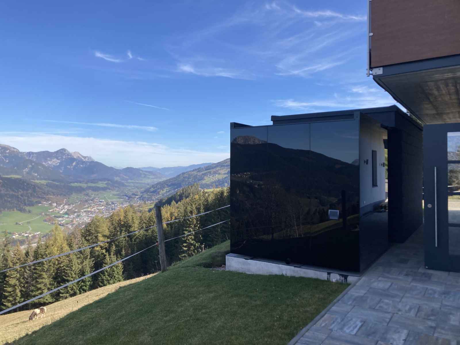 Maison à 3 apts moderne, confortable "alpenjuwel", 1'132 m au dessus du niveau de la mer, année de construction 2016, environnée par les arbres et prés. dans le quartier de rohrmoos, à 6 km du centre de schladming, à 3 km du centre de rohrmoos, situation isolée, surélevée sur une colline, à 1 km du domaine skiable, dans la verdure. en
