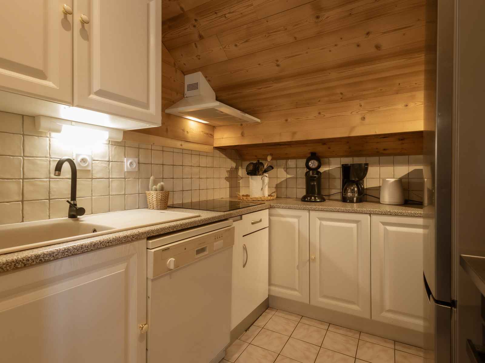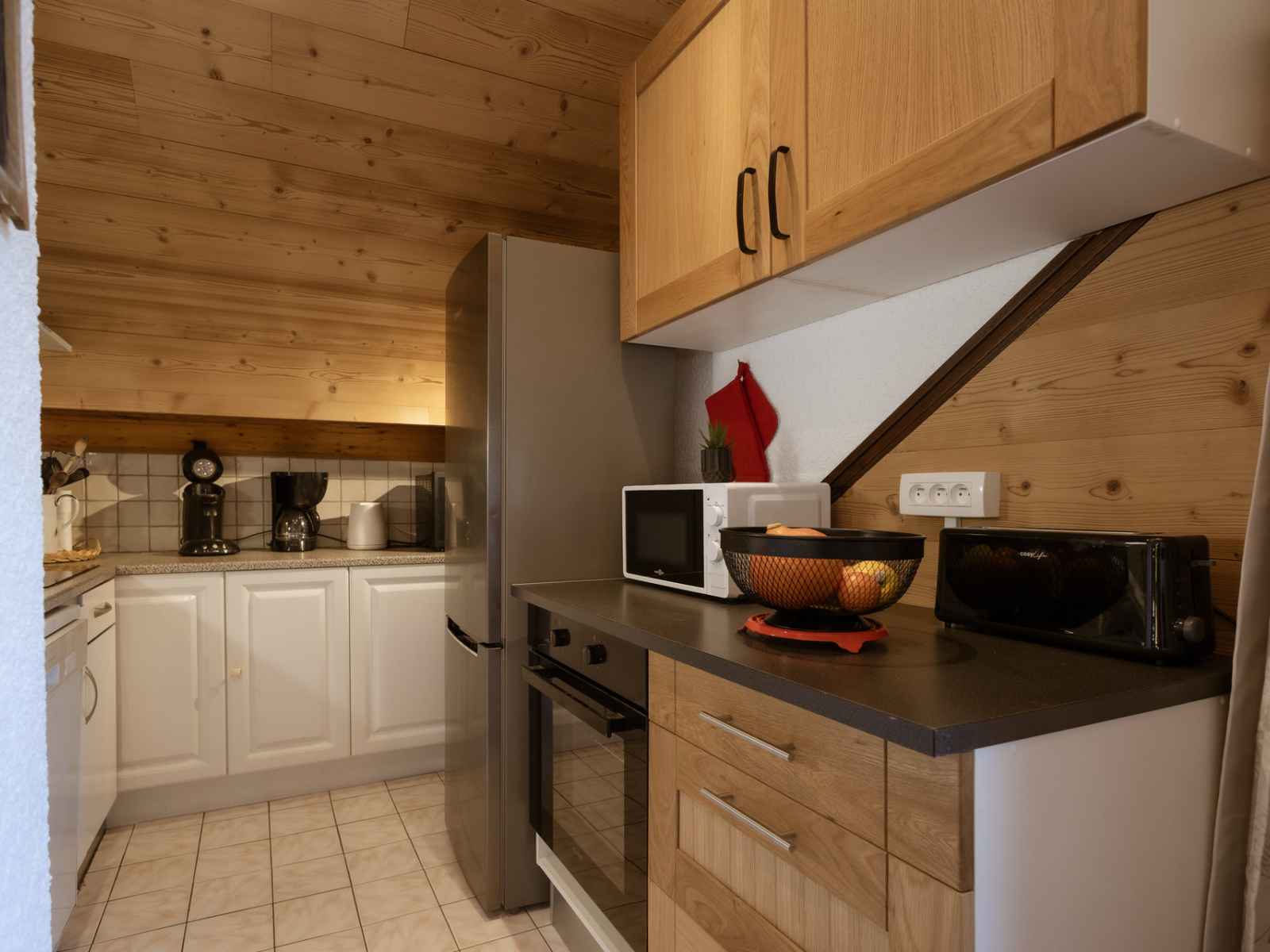 cuisine : four, micro-ondes, lave-vaisselle, réfrigérateur, plaque vitrocéramique.