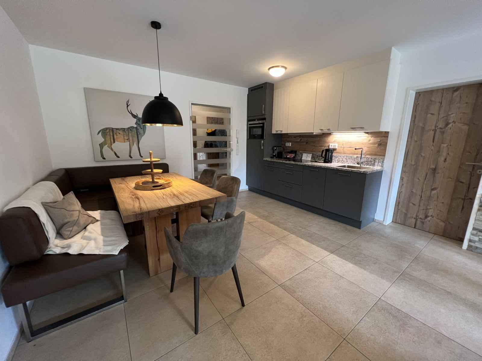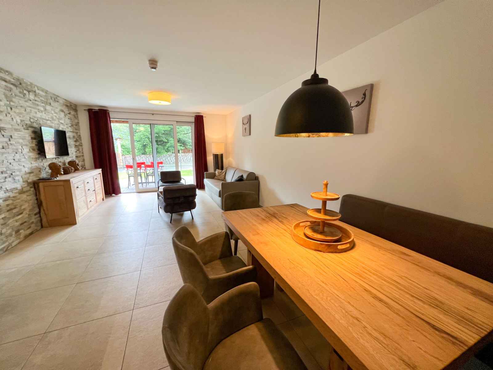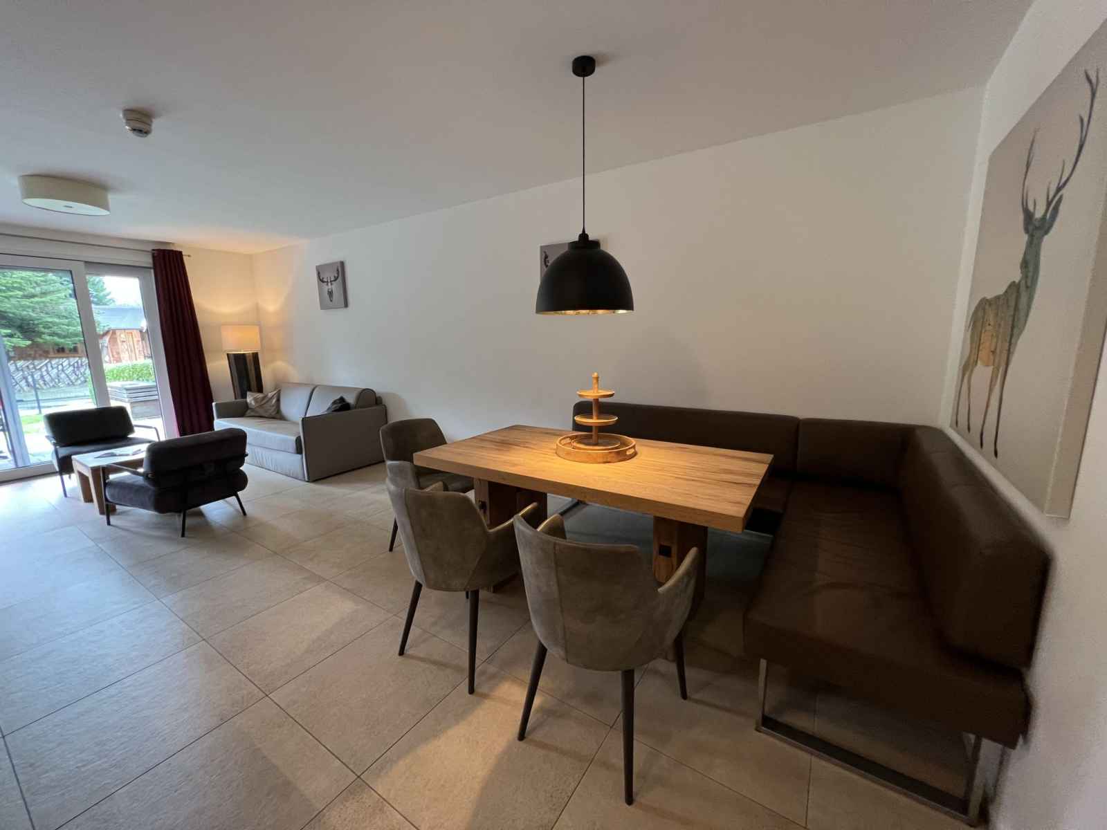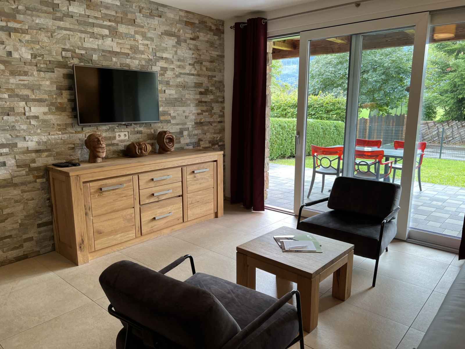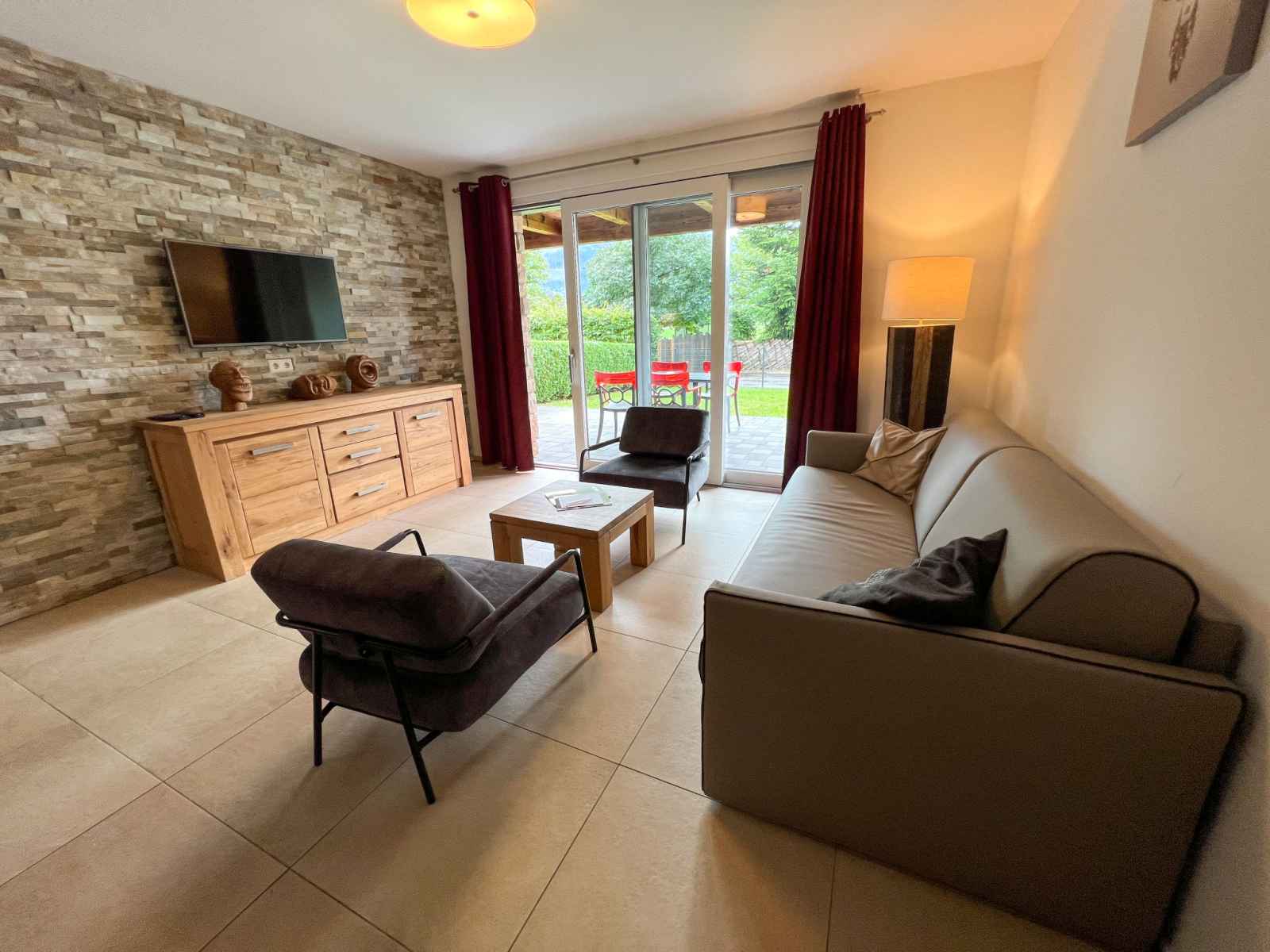 Cuisine/séjour (four, lave-vaisselle, 4 plaques vitrocéramiques, grille-pain, bouilloire électrique, cafetière électrique) avec coin repas. Douche/WC, bain/douche/WC. Chauffage par le sol. Sol en parquet, sol en pierres naturelles. Grande terrasse 20 m2, grand jardin. Meubles de terrasse. Vue sur les alentours. A disposition: fer à repasser, sèche-cheveux. Internet (Connexion WIFI, gratuit). Garage. Veuillez noter: logement non-fumeur. Détecteur de fumée, extincteur. 50628-001591-2023