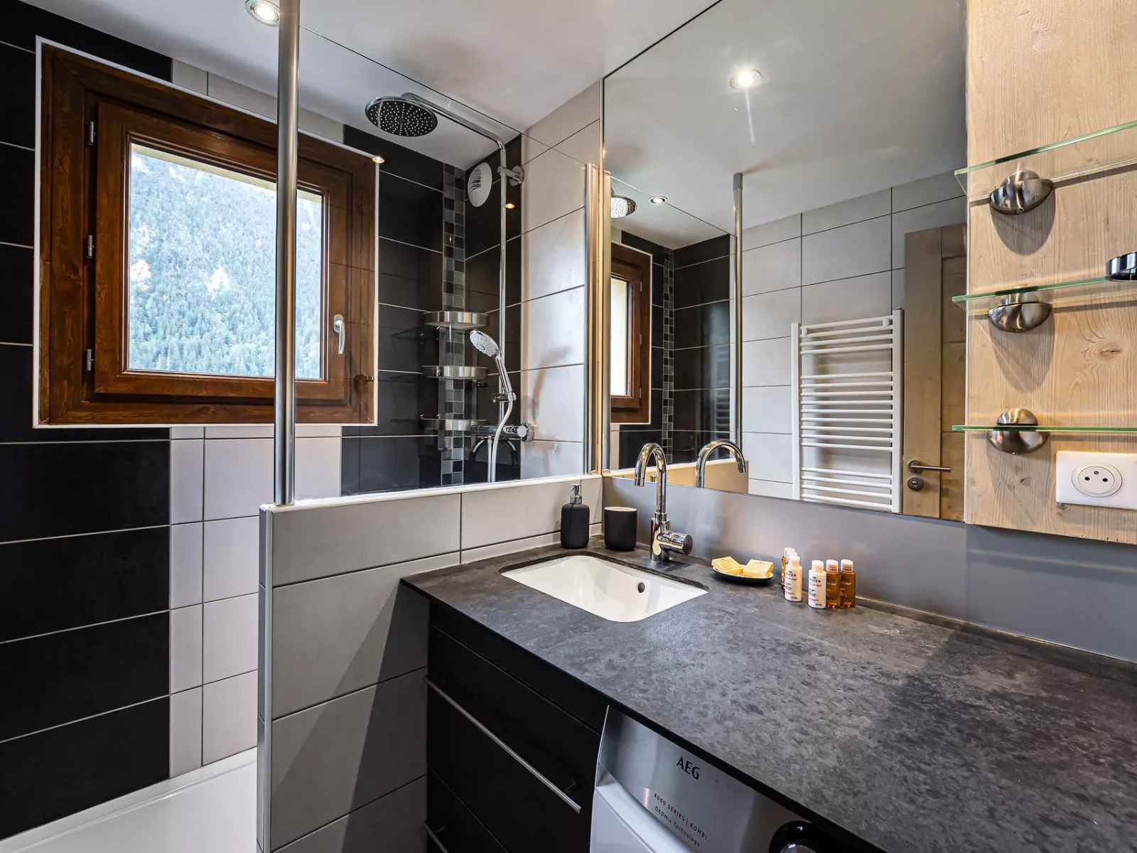 - Une salle de douche avec lave-linge séchant
