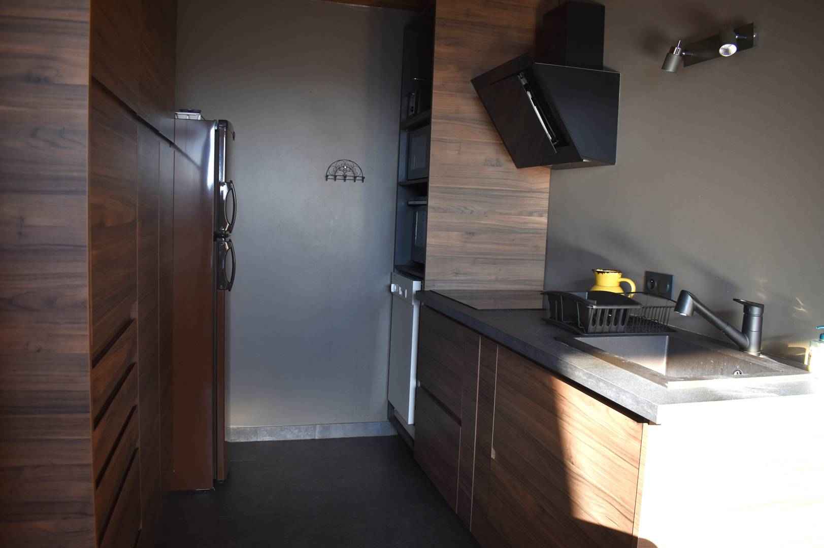 La cuisine ouverte sur le séjour comprend: une plaque de cuisson en vitrocéramique, d'un four ainsi que d'un four à micro-onde, d'un réfrigérateur, d'une hotte, d'un lave vaisselle et d'une cafetière à filtre.