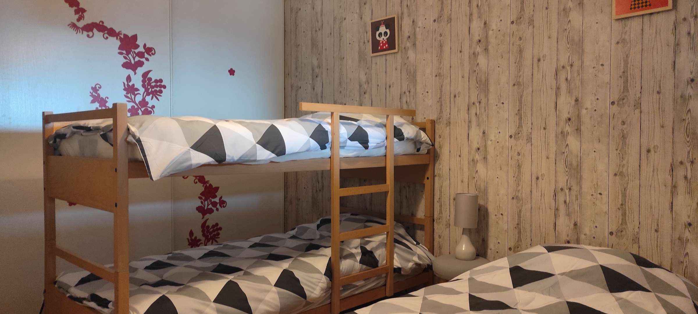 Chambre 2 – Chambre borgne avec une petite fenêtre donnant sur le séjour, équipée de deux lits superposés, un lit simple et un placard de rangement.