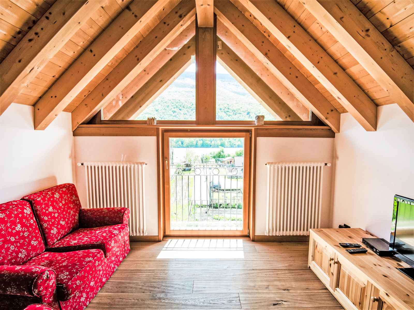 Apt 3 pièces 60 m2 sur 2 niveaux, situation sud. spacieux et clair, partiellement mansardé, complètement rénové en 2014, aménagement confortable et avec beaucoup de bois: grand séjour/salle à manger mansardé, ouvert avec baie vitrée avec 1 divan-lit, table pour les repas et tv (satellite) (écran plat). 1 chambre double. 1 petite chambre