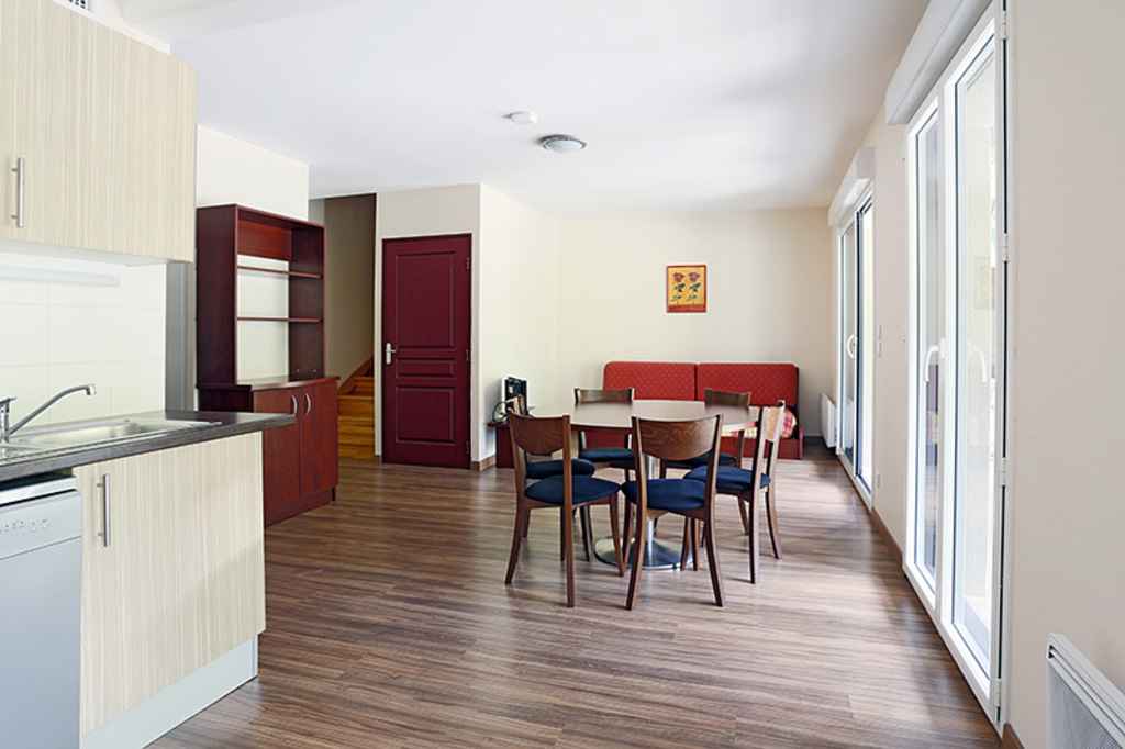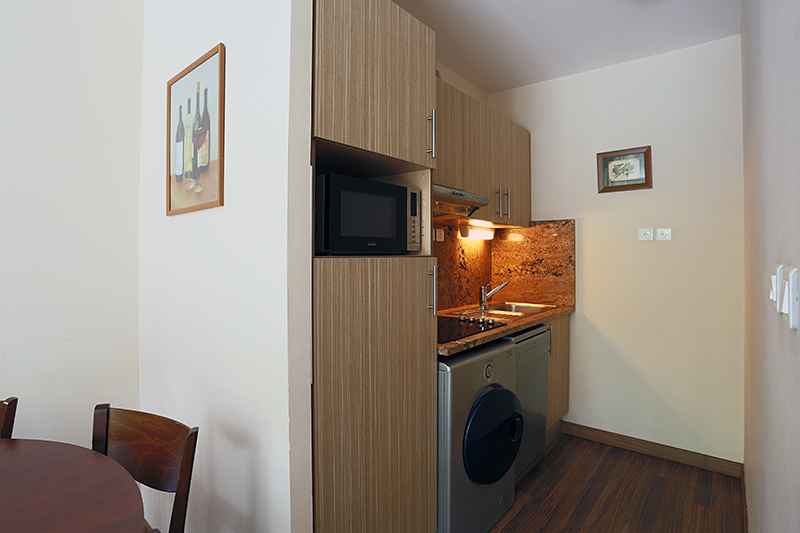 kitchenette équipée de 4 plaques vitrocéramiques, d'un micro ondes, d'un réfrigérateur et d'un lave vaisselle.