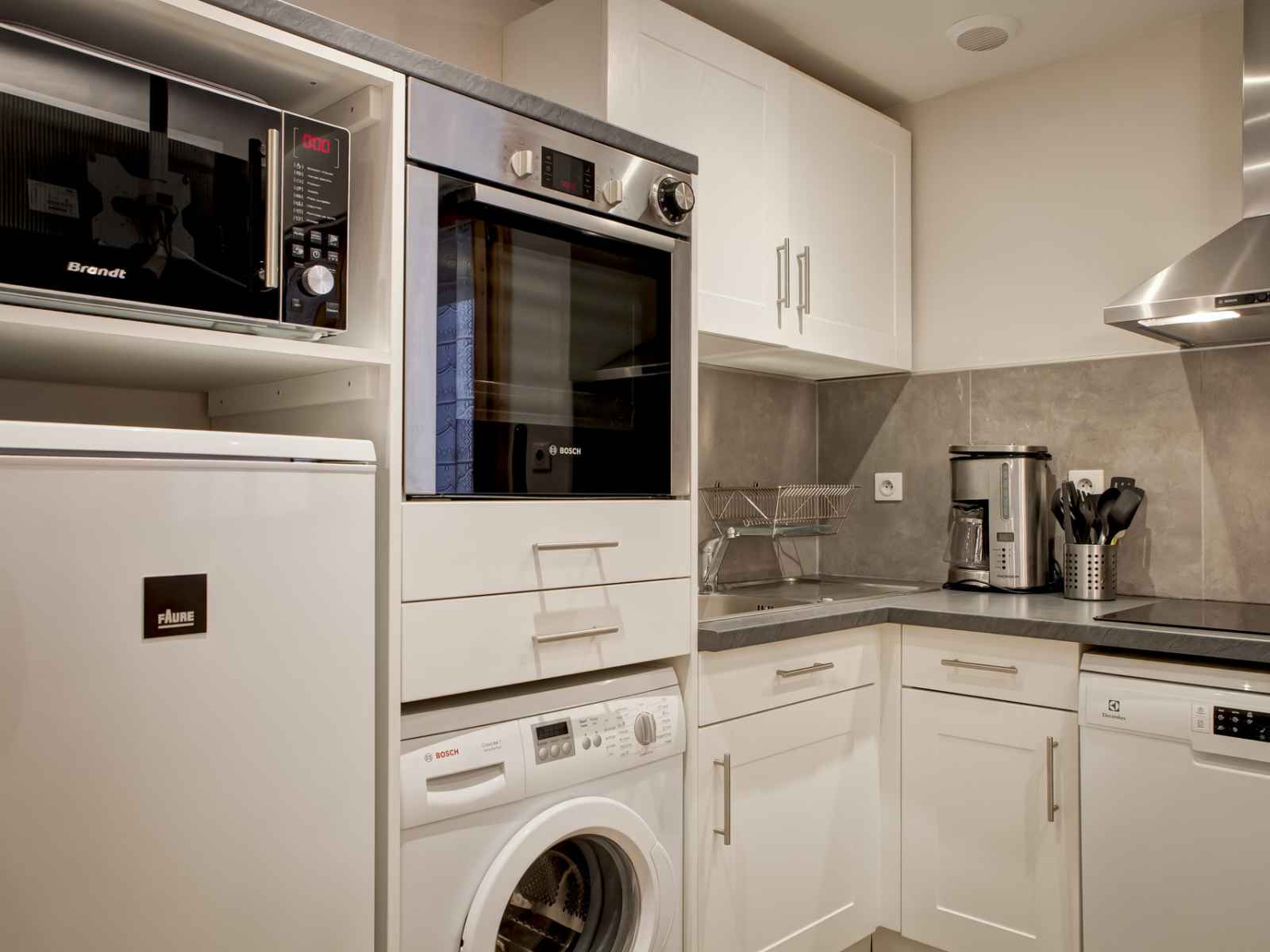 cuisine équipée ouverte sur la pièce à vivre avec : plaques vitrocéramiques, four traditionnel, micro-ondes,