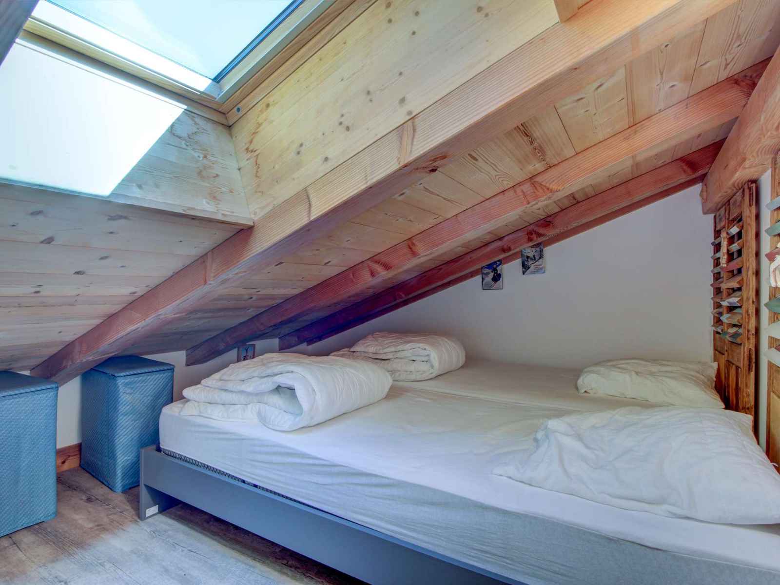 - une chambre avec 1 lit double (160x190cm) et un escalier d'accès à une petite chambre mansardée avec 2 lits simples (plafond bas)