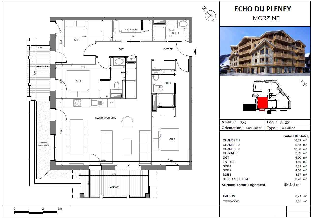 Echo du pleney a204 est un superbe appartement 3 chambres + cabine au coeur de morzine, au 2ème étage d'une résidence neuve avec ascenseur. proche de toutes commodités et à 500m des pistes de morzine, ce spacieux appartement de 90m² se compose ainsi :