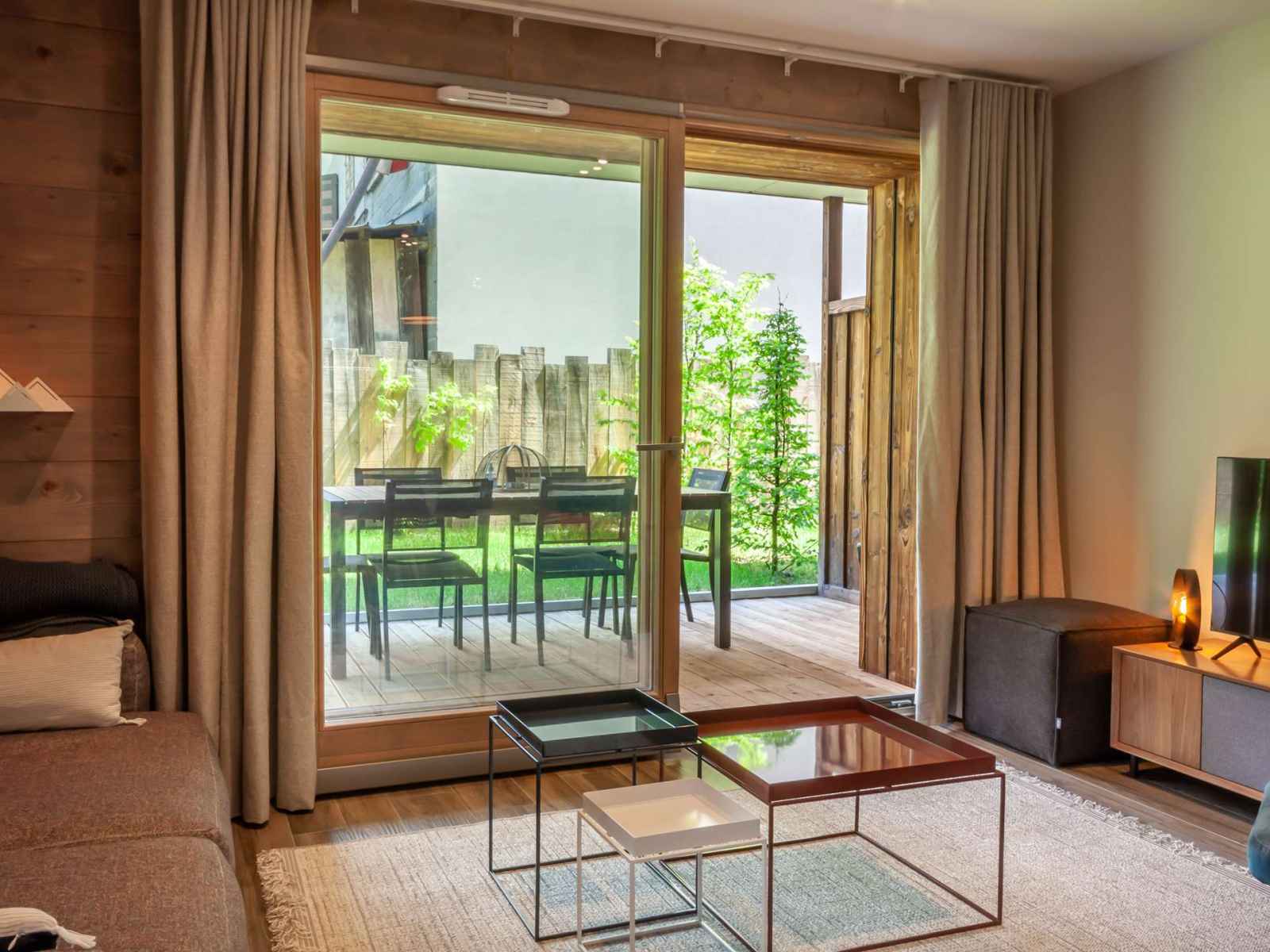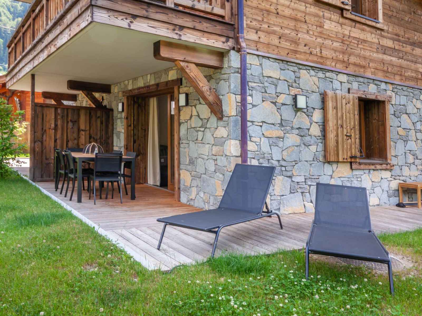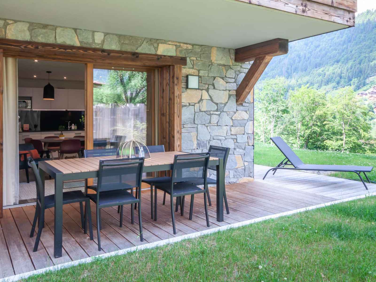 - Pièce à vivre avec coin cuisine ouverte sur le salon/séjour, terrasse avec jardin, vue dégagée sur les montagnes