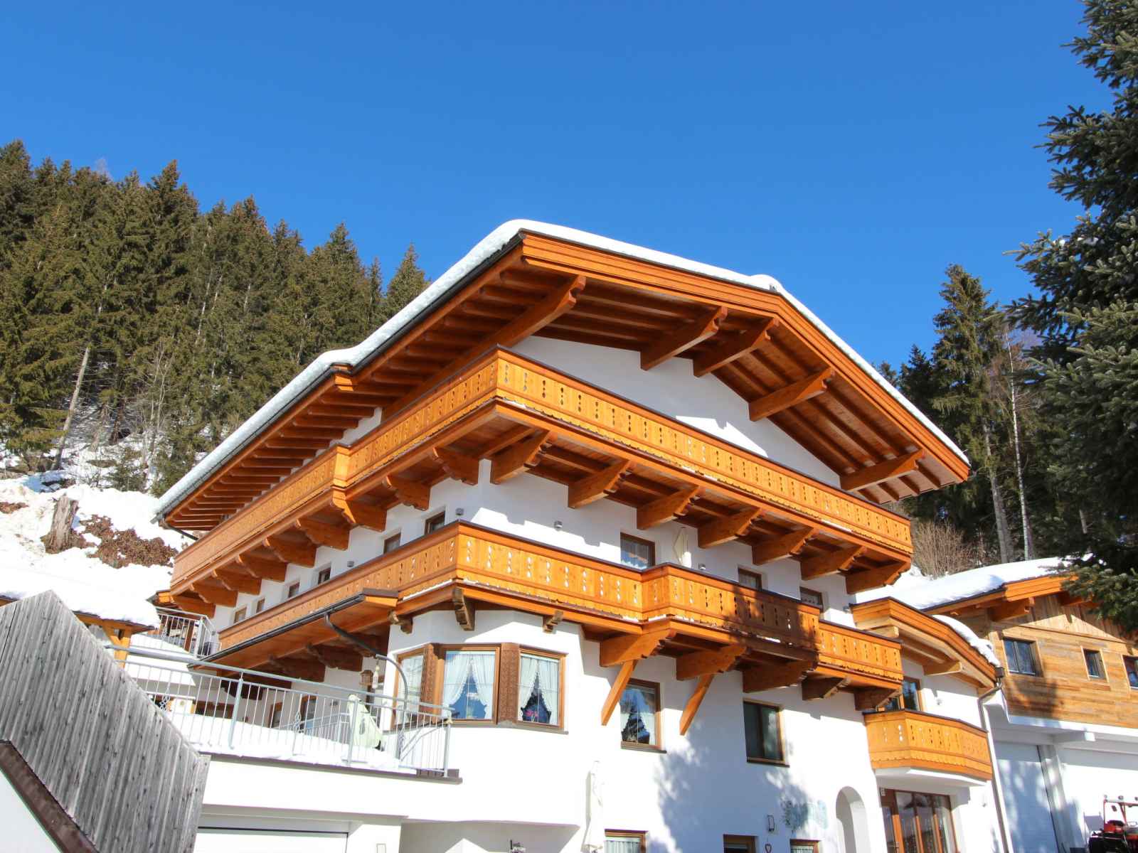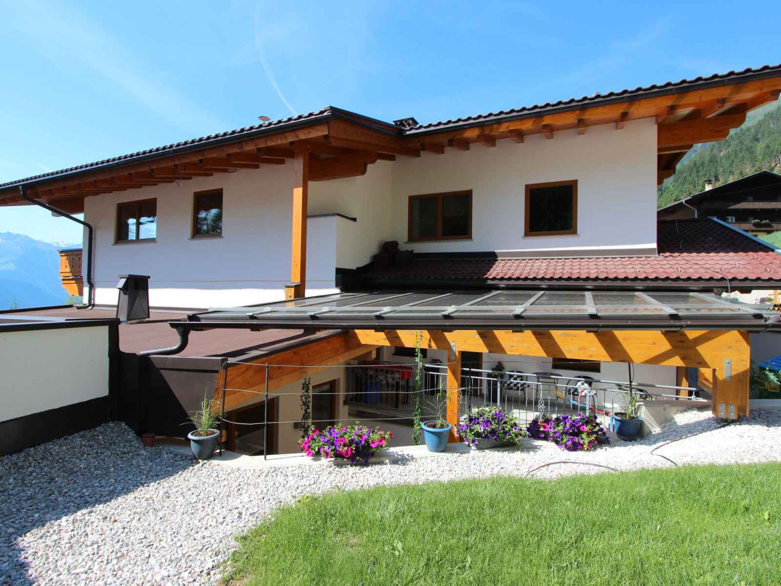 jardin sur plusieurs niveaux entretenu, 100 m2, pré. bain à remous , tonnelle, meubles de jardin. infrastructures de la maison: connexion wifi, sauna, bains de vapeur (hammam), spa, réduit pour bicyclettes, local pour les skis, chauffage central, appareil de séchage de chaussures à ski. accès en voiture jusqu'à la maison. en hiver, merci de prévoir des chaînes. place de parking (couvert, nombre de places limité) près de la maison. supermarché 4.5 km, restaurant 1.3 km, arrêt de bus 4.5 km, gare ferroviaire 4.5 km, piscine 4.5 km. télécabine 6 km. arrêt du ski-bus 10 m. les domaines skiables de renommée sont facilement accessibles: zillertal arena 6 km, ski-zillertal-3000 8 km. veuillez noter: non adapté aux enfants de moins de 6 ans. ski-bus gratuit. d’autres appartements sont également proposés à la location dans cette maison de vacances. horaires d'ouverture de l'espace bien-être de 17h00 à 21h00. bain de vapeur "aqua life", une baignoire en bois de cèdre remplie d'eau de source pure et chauffée à 35 - 40 degrés. 1 serviette de sauna et 1 peignoir par personne sont disponibles gratuitement. le pavillon de jardin est chauffé et peut accueillir 10 personnes. jouets à disposition. magasin de vélos électriques payant. pas de possibilité de recharge pour les voitures électriques à la maison.