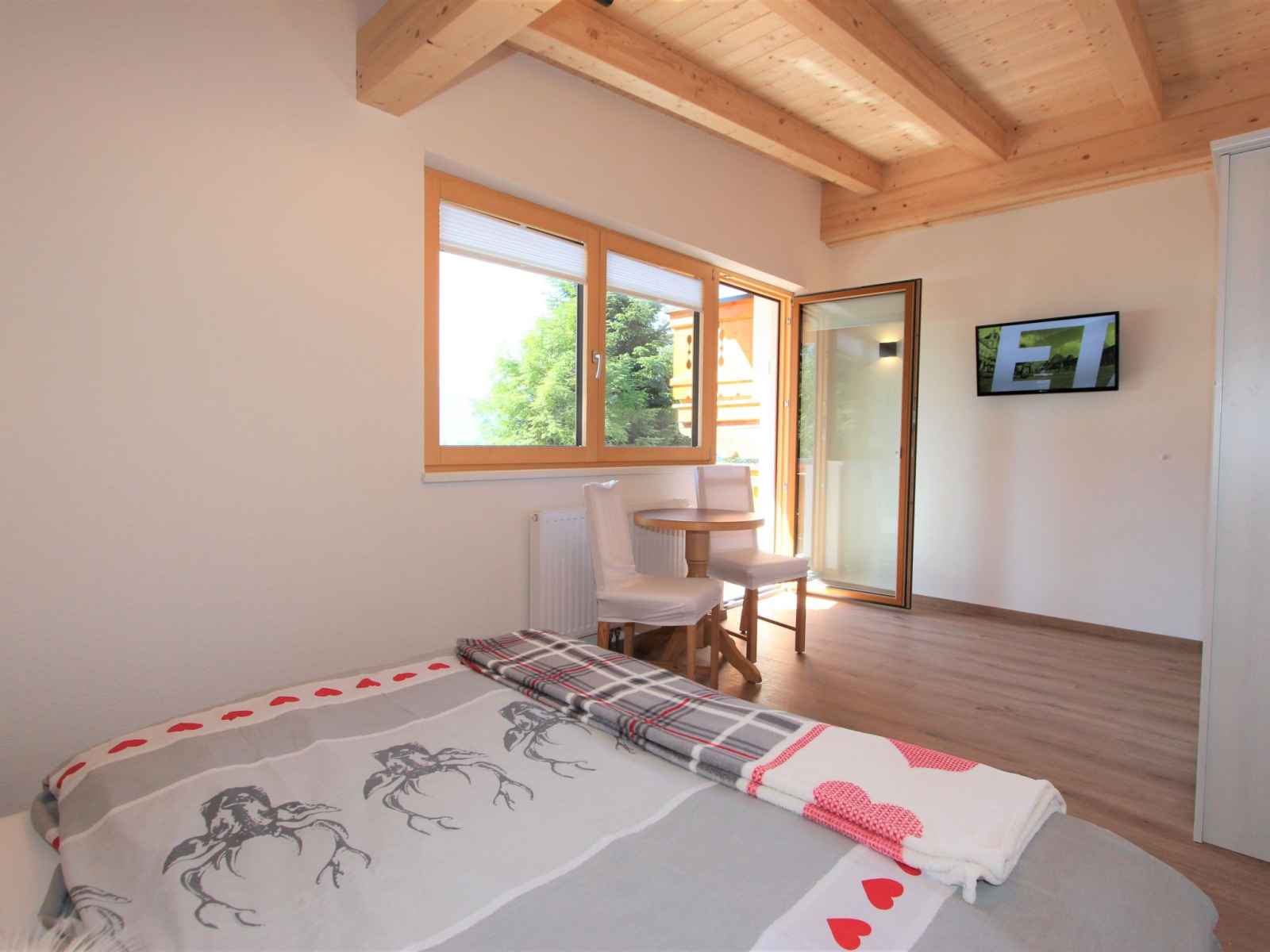 1 chambre double avec TV (satellite) (écran plat). 1 grande chambre double avec TV (satellite) (écran plat). Sortie sur le balcon. Douche/WC. Meubles de terrasse. Très belle vue sur les montagnes. A disposition: sèche-cheveux. Internet (Connexion WIFI). Place de parking (2 Voitures). Veuillez noter: logement non-fumeur. Entrée privée. Pas de liaison interne entre les étages. L'entrée de l'appartement est accessible par 4 marches. Les 2 chambres à l'étage se trouvent à l'extérieur de l'appartement et sont accessibles par l'escalier.