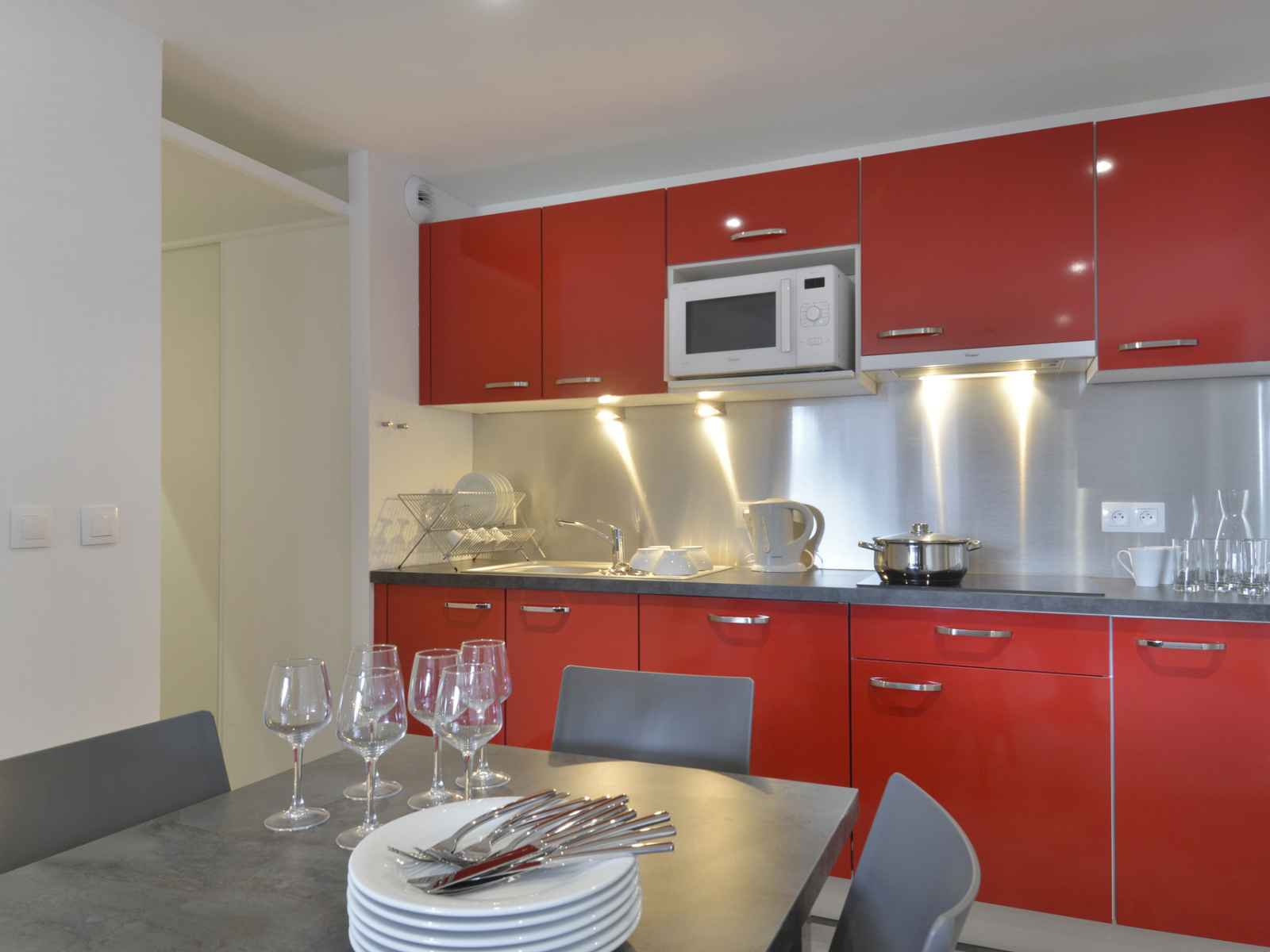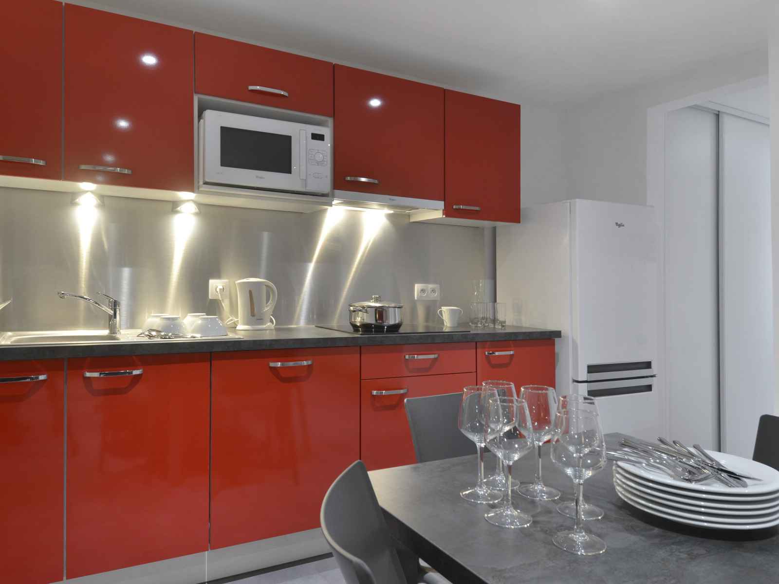 cuisine : ouverte sur le séjour avec four mixte, 4 plaques vitrocéramiques,