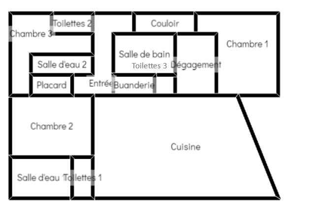 chambre 1: un lit double (160x200), télévision, accès balcon + dégagement : coin