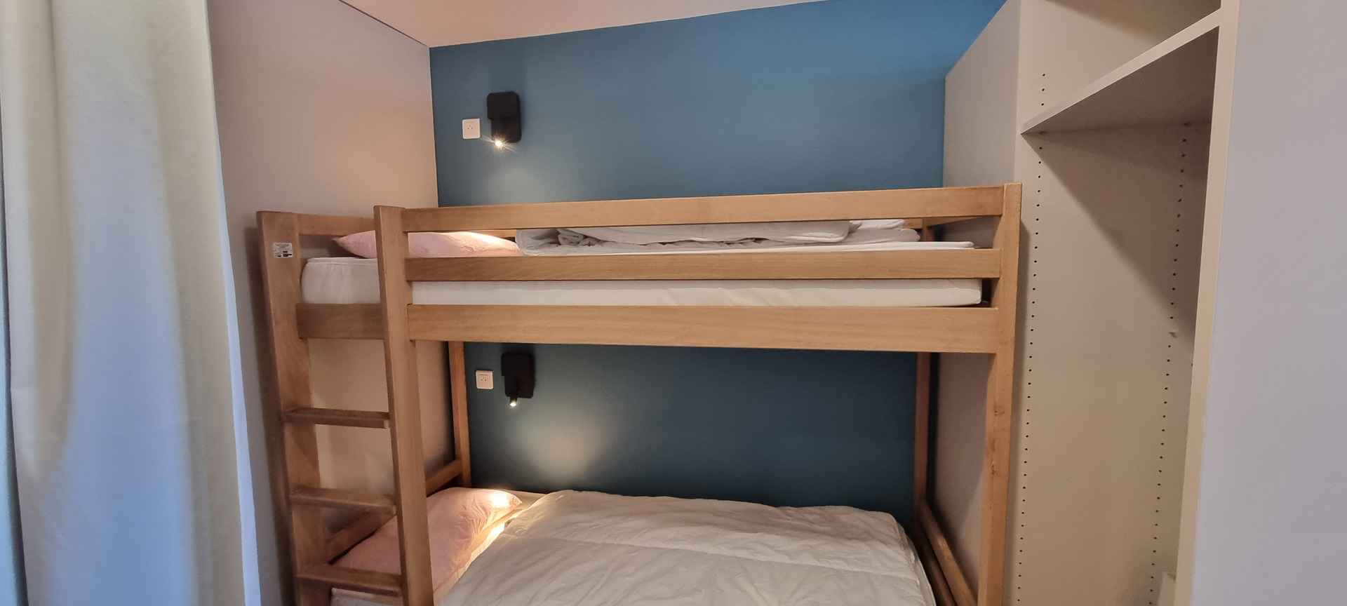 nord offre une jolie vue sur le Mont-Blanc Le séjour comprend 1 lit peigne pour 2 personnes, une table haute pour 4 personnes avec tabourets et une télévision écran plat. Pour votre confort, une cabine avec 2 lits superposés est à votre disposition, fermée par une porte coulissante. La cuisine, ouverte est équipée d'un four mixte, de 2 plaques induction, d'un réfrigérateur top et d'un lave vaisselle. La salle de bains dispose d'une douche et d'un meuble vasque. Les WC sont séparés De nombreux rangements sont disponibles au niveau de la porte d'entrée Services : Animaux admis avec supplément de 30€. Commerces dans la résidence. Résidence skis aux pieds et casier à skis. Equipé de couettes Linge de lit et de toilette en coton et ménage de fin de séjour en supplément. Matériel bébé sur demande, réservation conseillée.