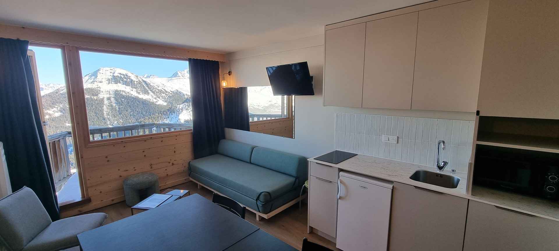 ce studio se trouve au niveau "n" du paquebot des neiges et est accessible par l'ascenseur "diamant". il se compose d'un séjour, d'une cuisine séparée, d'un coin cabine, d'une salle de bains et d'un wc indépendant. son balcon exposé