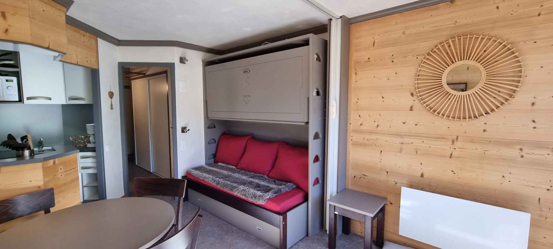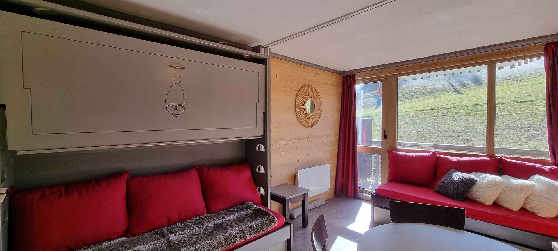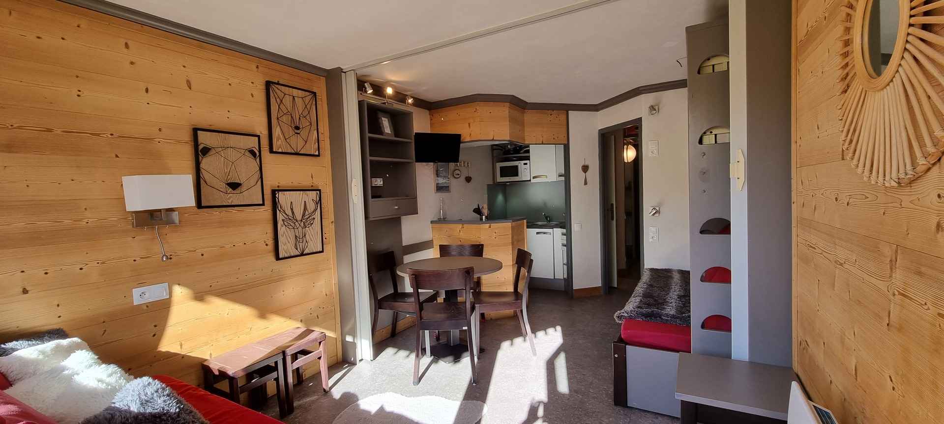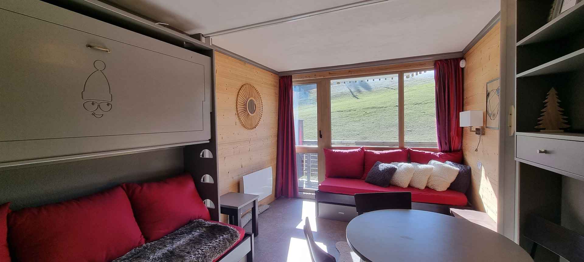 ce studio, exposé sud et offrant une jolie vue pistes, se situe au niveau "d" du paquebot des neiges. accessible par l'ascenseur "flèche", il se compose d'un séjour d'une cuisine moderne ouverte sur un séjour et d'un salle de bains.