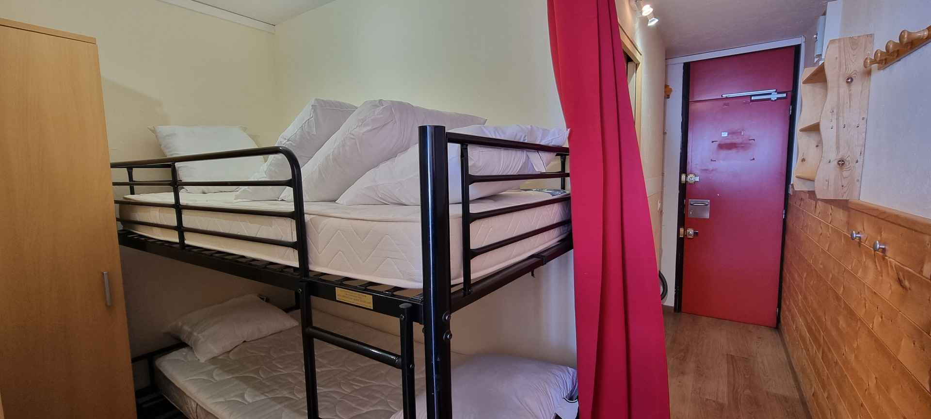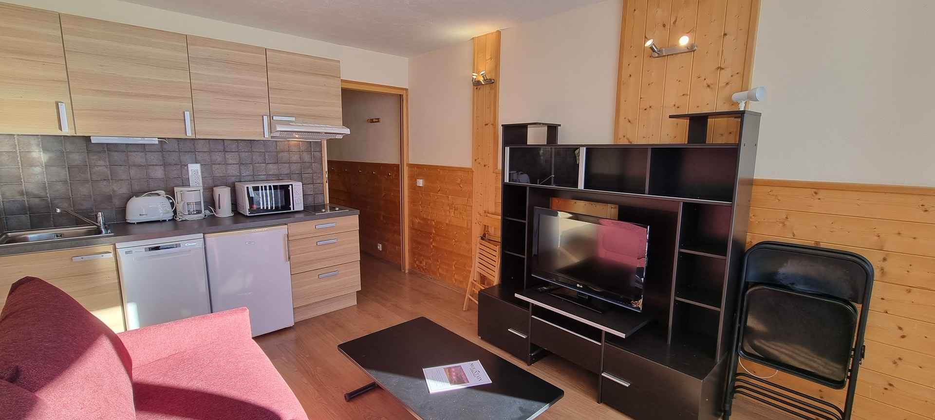 canapé rapido (140cm) pour 2 personnes et une télévision écran plat. Une cabine avec 2 lits superposés est également à votre disposition. La cuisine, ouverte sur le séjour, est équipée d'un four mixte, de 2 plaques vitrocéramiques, d'un réfrigérateur top et d'un lave-vaisselle. La salle de bains dispose d'une baignoire, d'un WC et d'un lave linge. Services : Animaux non tolérés. Commerces dans la résidence. Résidence skis aux pieds et casier à skis. Equipé de couvertures Linge de lit et de toilette en coton et ménage de fin de séjour en supplément. Matériel bébé sur demande, réservation conseillée.
