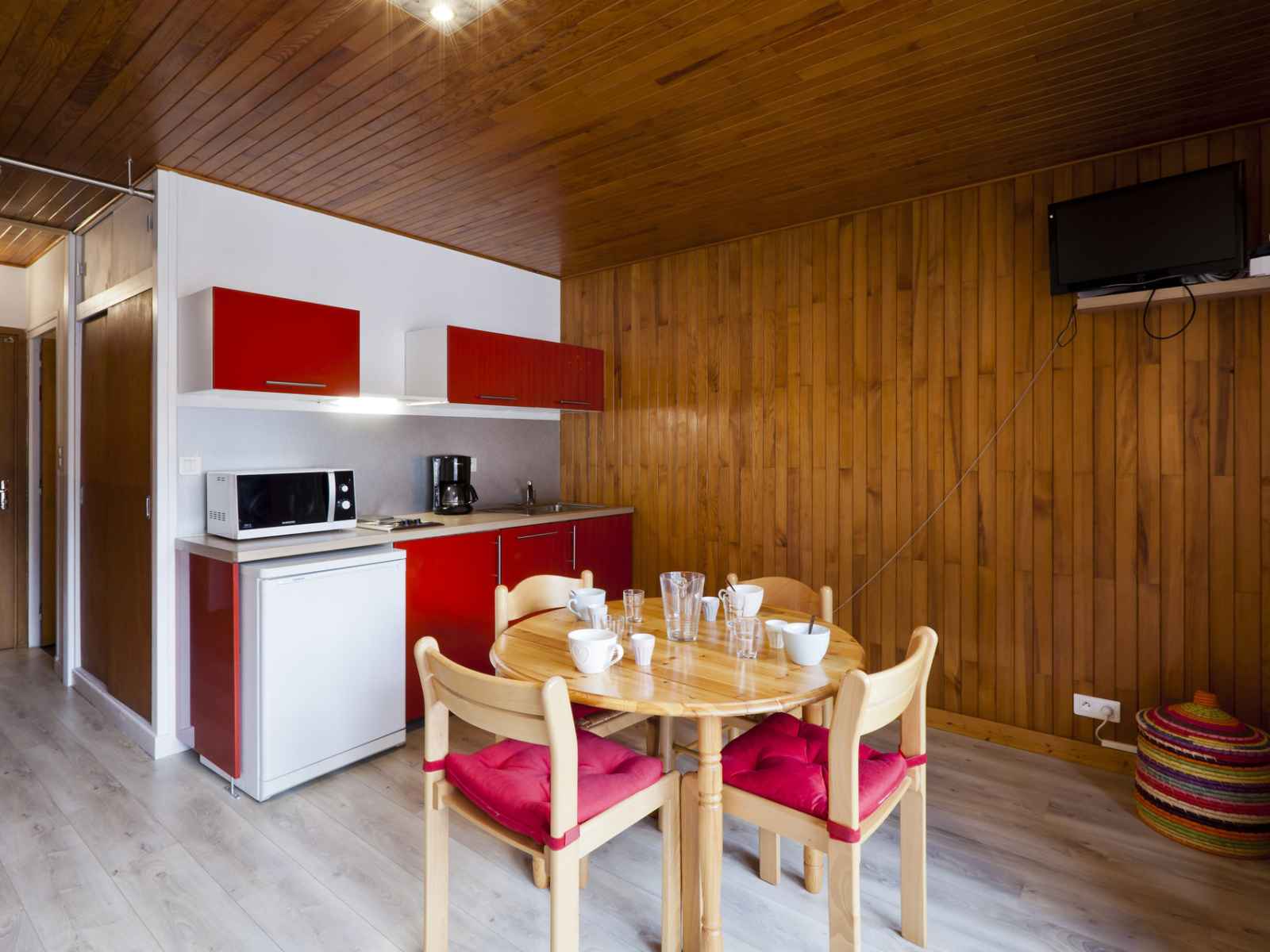 pièce à vivre avec espace repas et télévision, entrée avec placard de rangement.