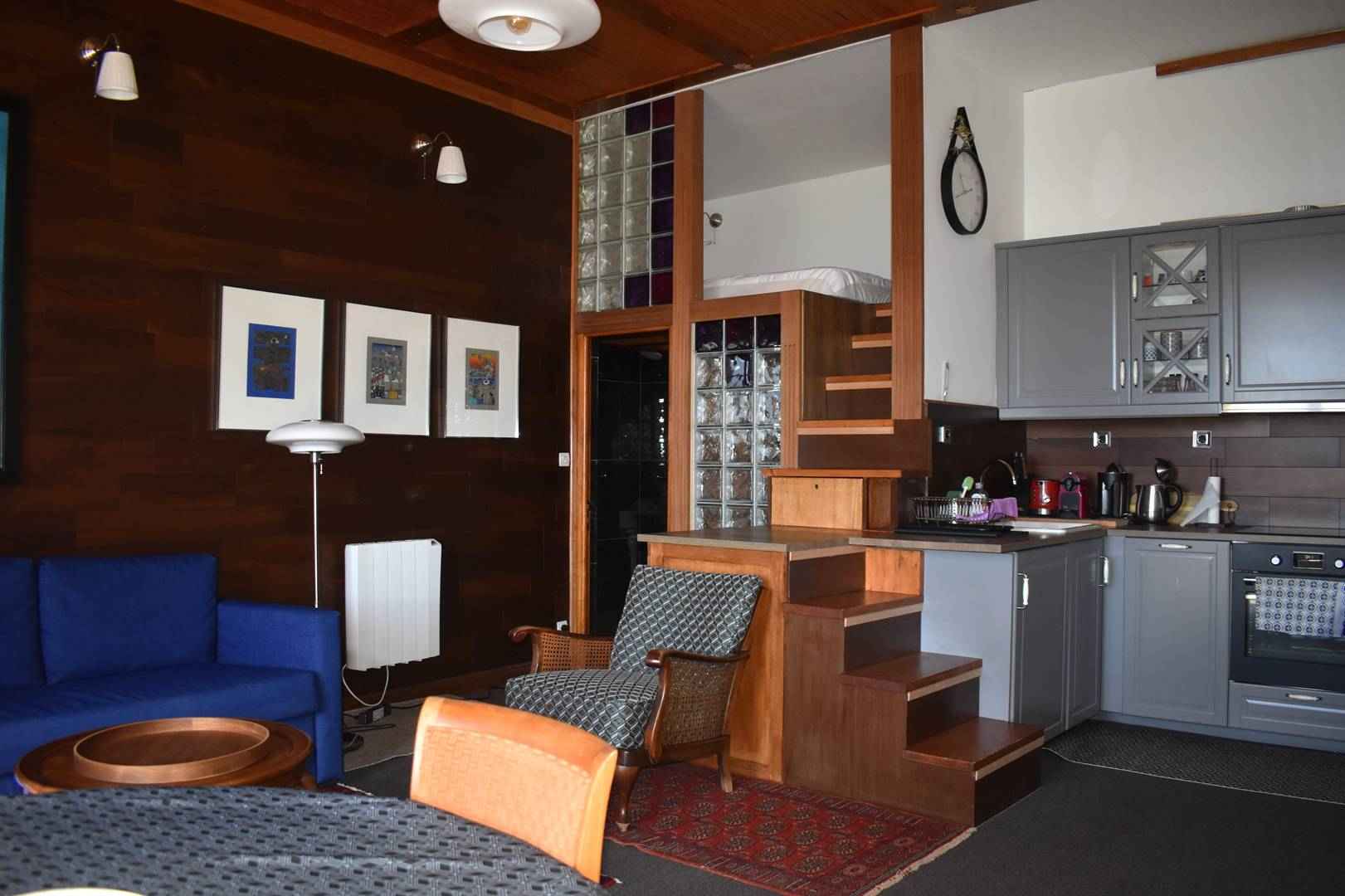 convertible, TV, un coin salle à manger et un coin cuisine équipée avec four, cafetière et plaques de cuisson. Tout cela donnant sur une magnifique vue dégagée sur la chaîne des Pyrénées.