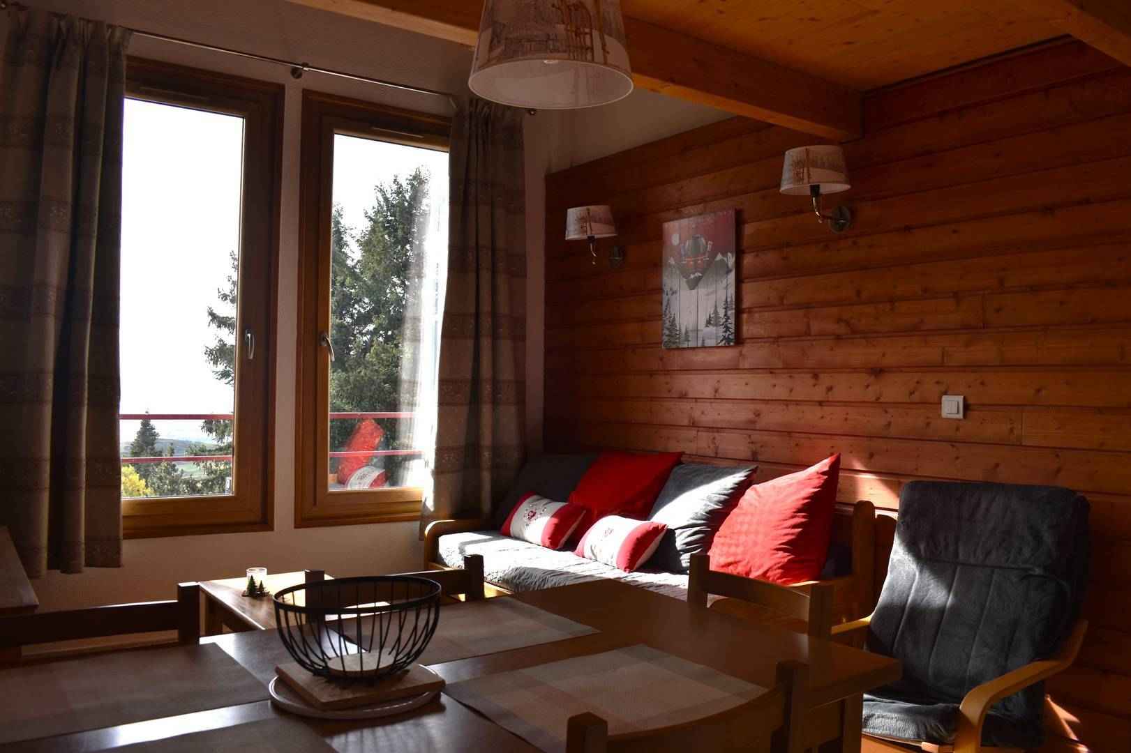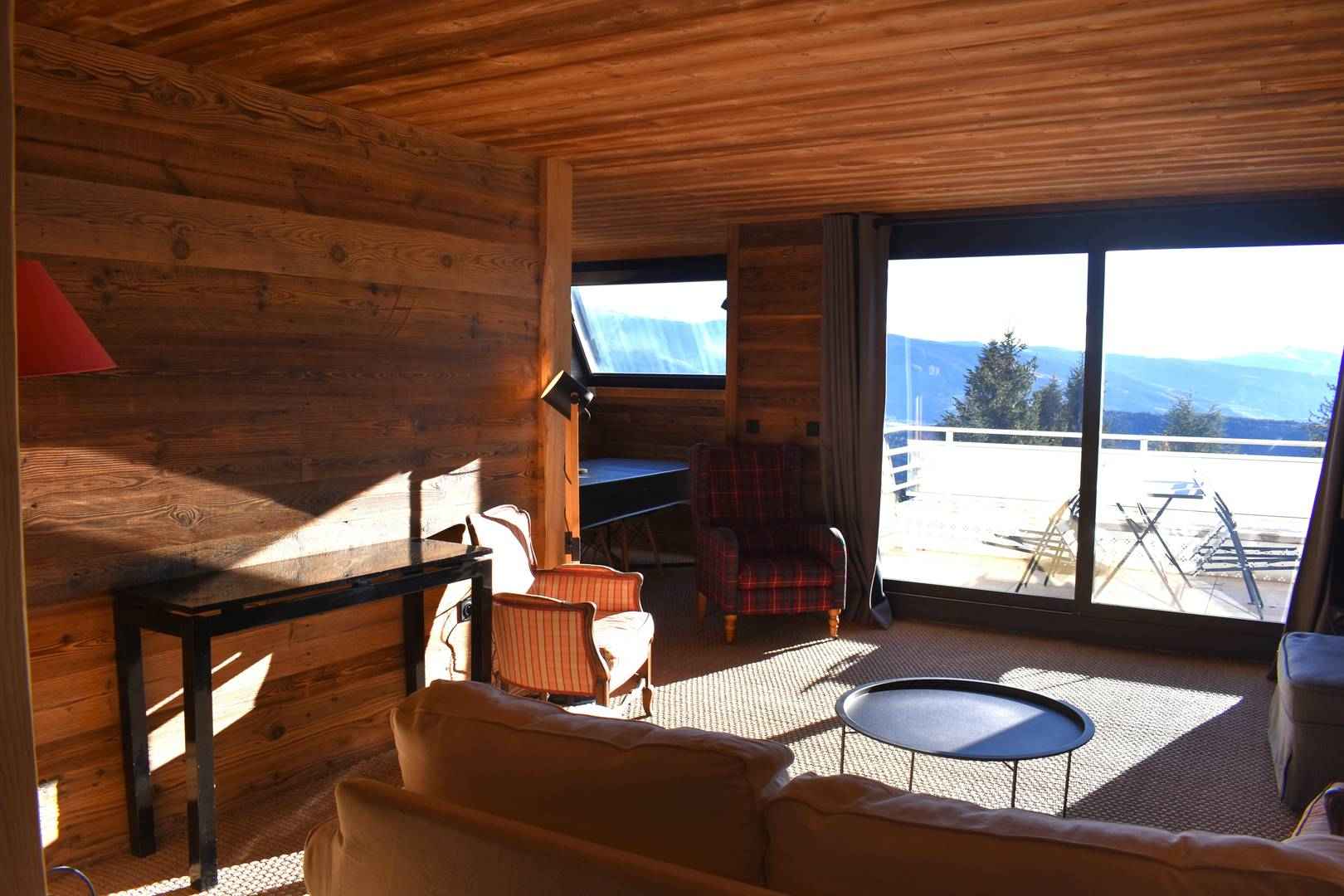 Le séjour exposé plein sud dispose d'un convertible pour deux personnes et d'une table à manger.