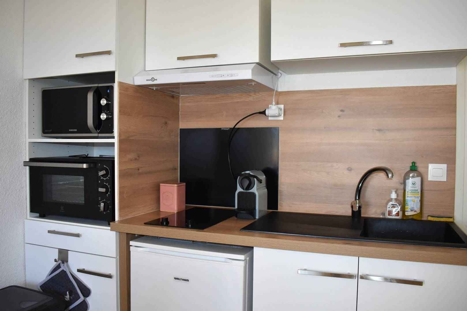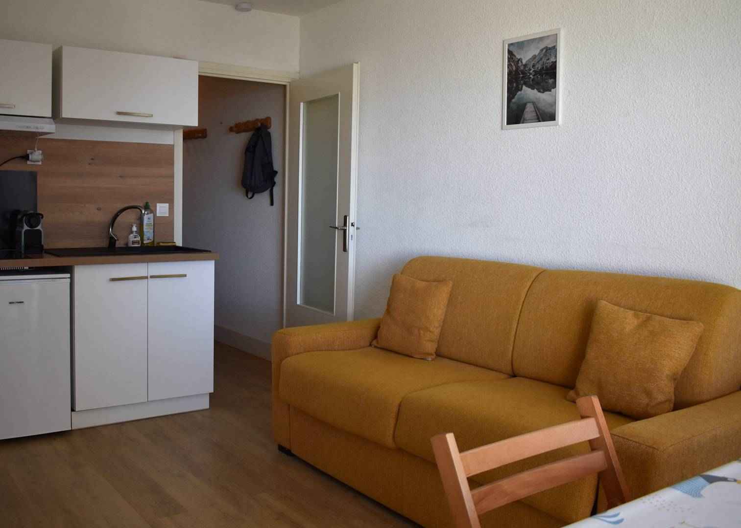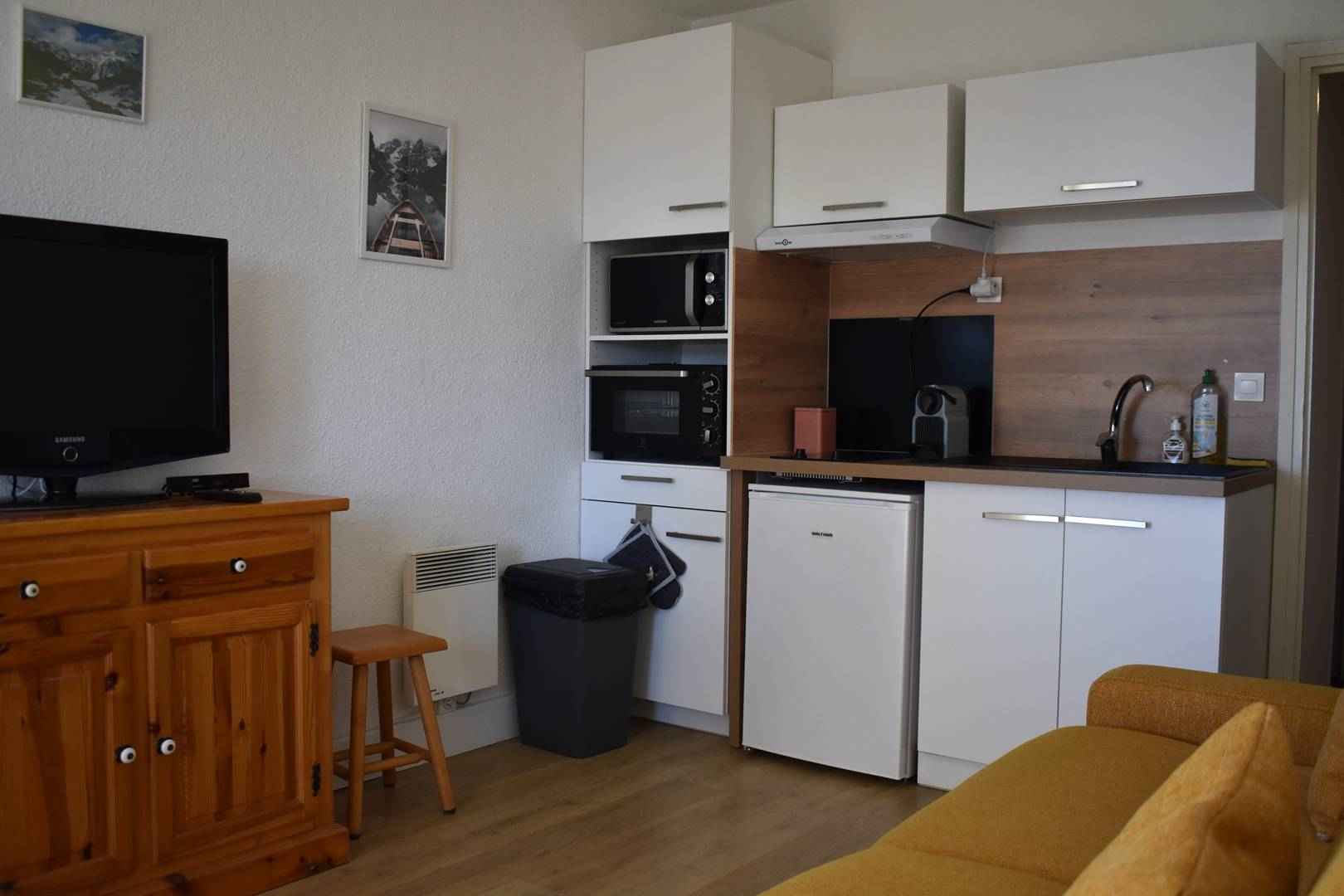 Séjour avec coin cuisine équipée. La cuisine est donc équipée d 'un frigo TOP, plaque de cuisson électrique 2 feux, un mini four, un micro-ondes et une cafetière Nespresso.