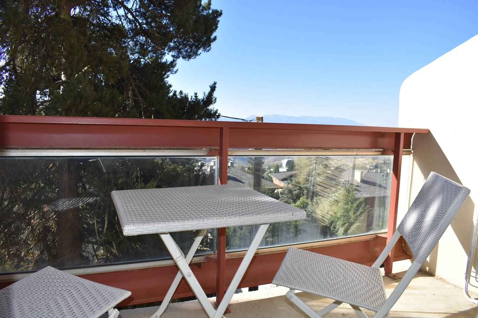 Balcon plein sud avec une table et chaises pour pouvoir profiter de la vue et de la tranquillité.