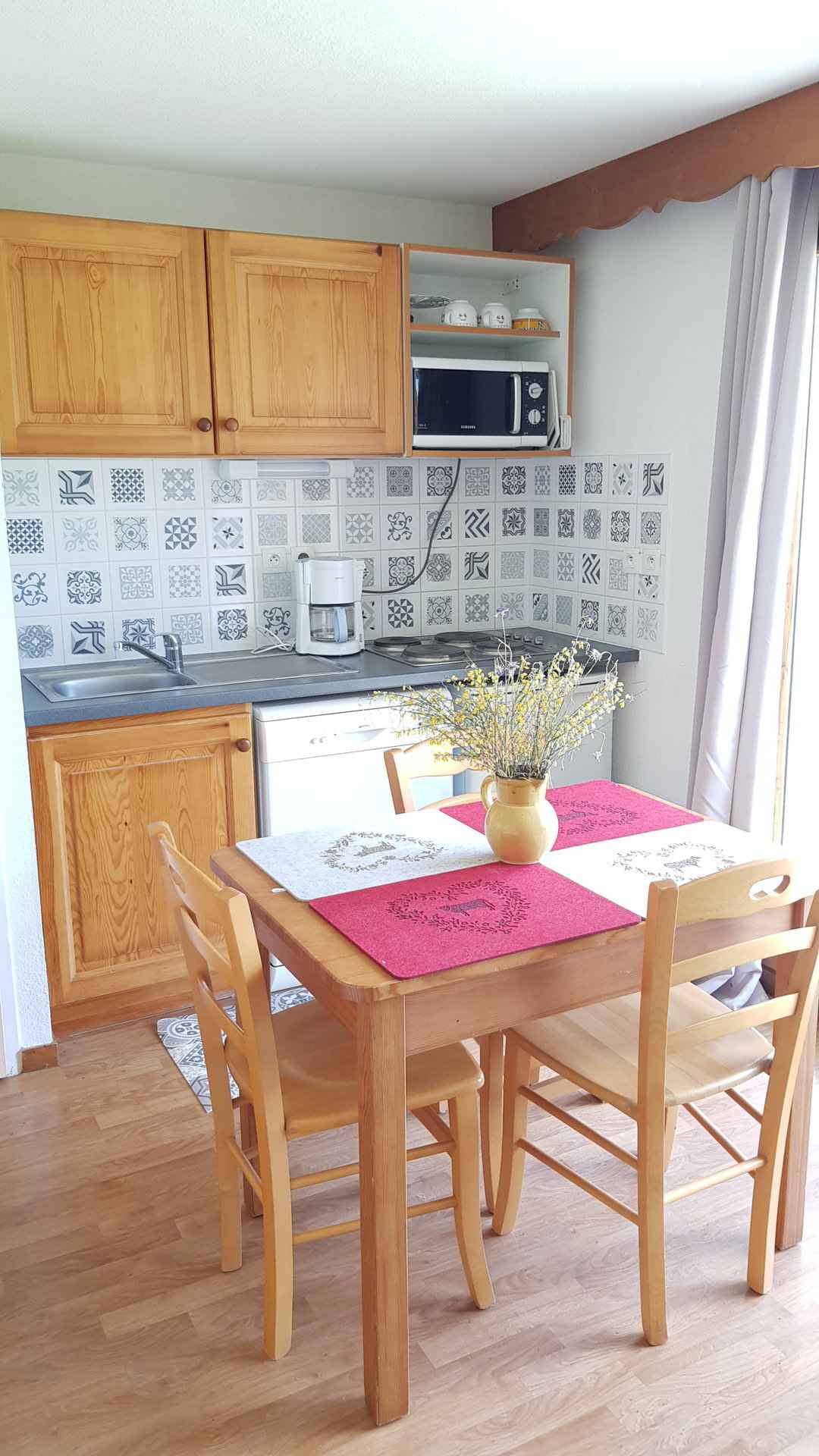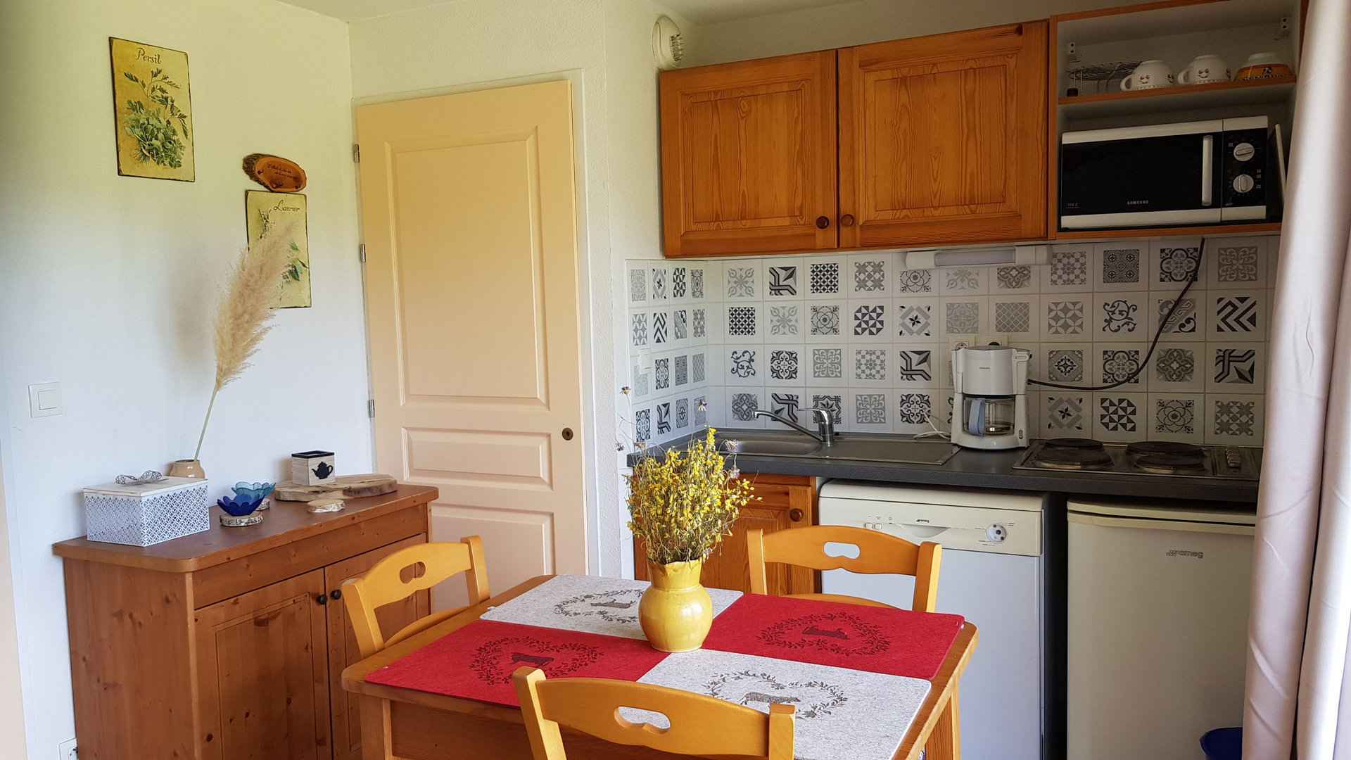 coin cuisine équipé avec plaques électriques, réfrigérateur, micro-ondes, lave-vaisselle, cafetière à filtre et senseo, bouilloire, nécessaire de vaisselle.