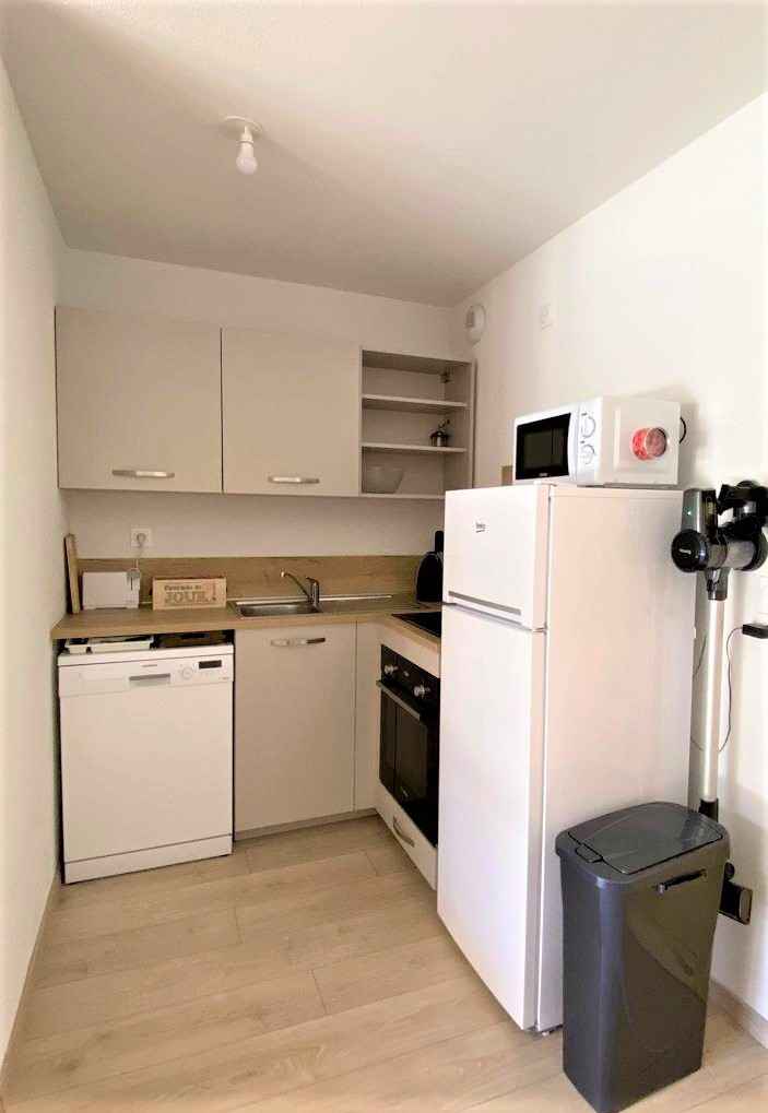 coin cuisine équipée avec réfrigérateur, plaques vitrocéramiques, four, micro-ondes, lave-vaisselle, cafetière nespresso, grille-pain, nécessaire de vaisselle, coin repas, aspirateur.