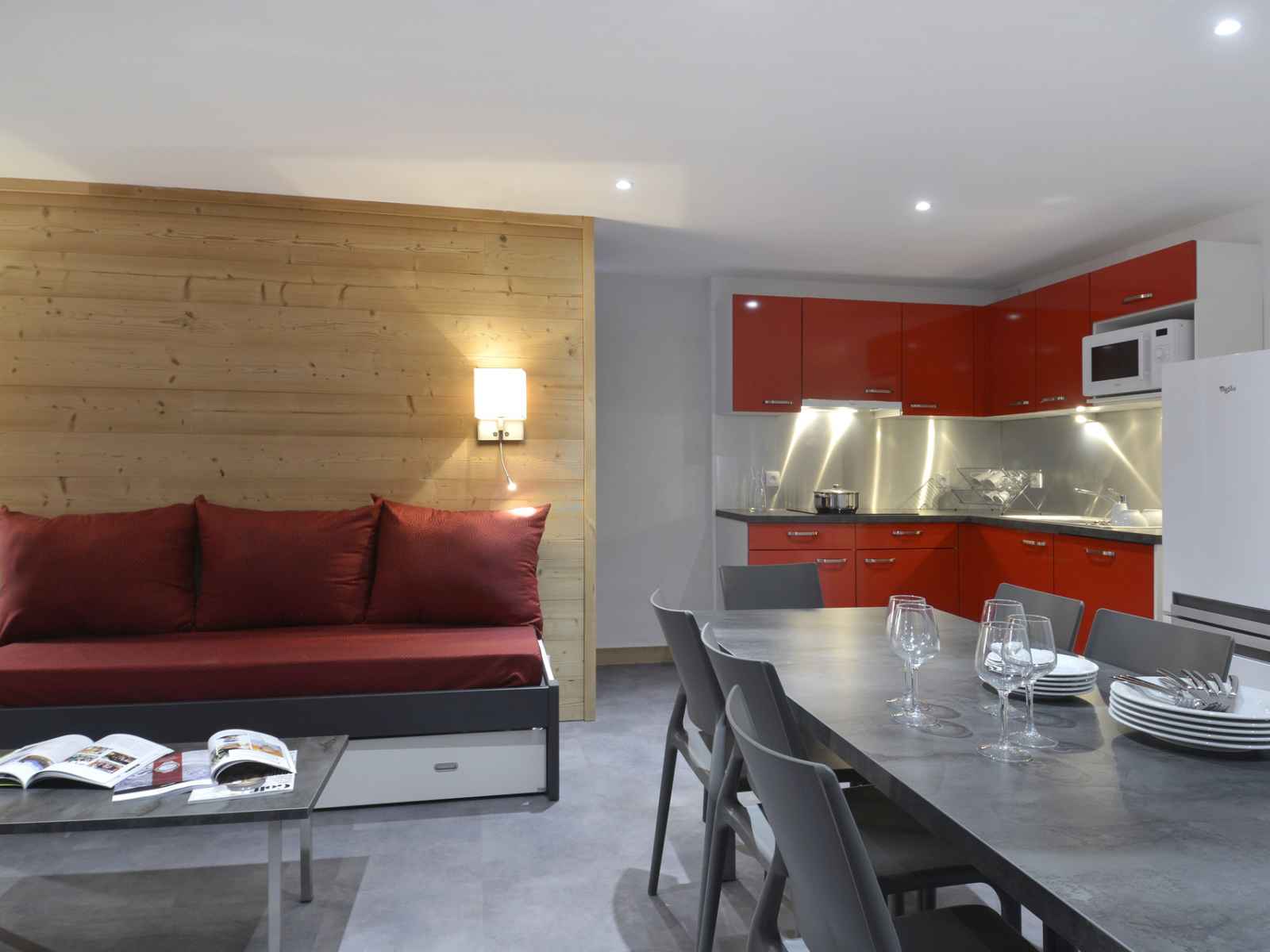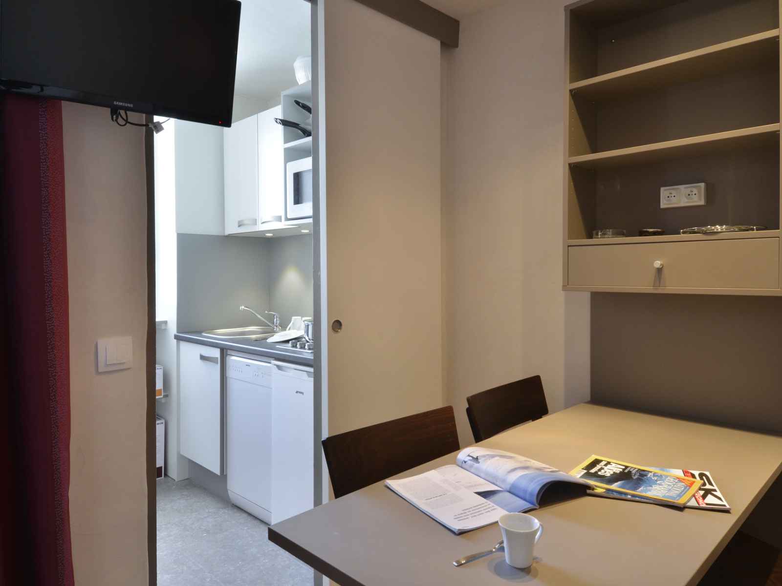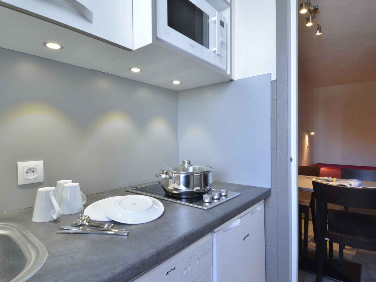cuisine : avec un micro-ondes grill, 1 plaque vitro-céramique 2 feux, un réfrigérateur, un lave vaisselle