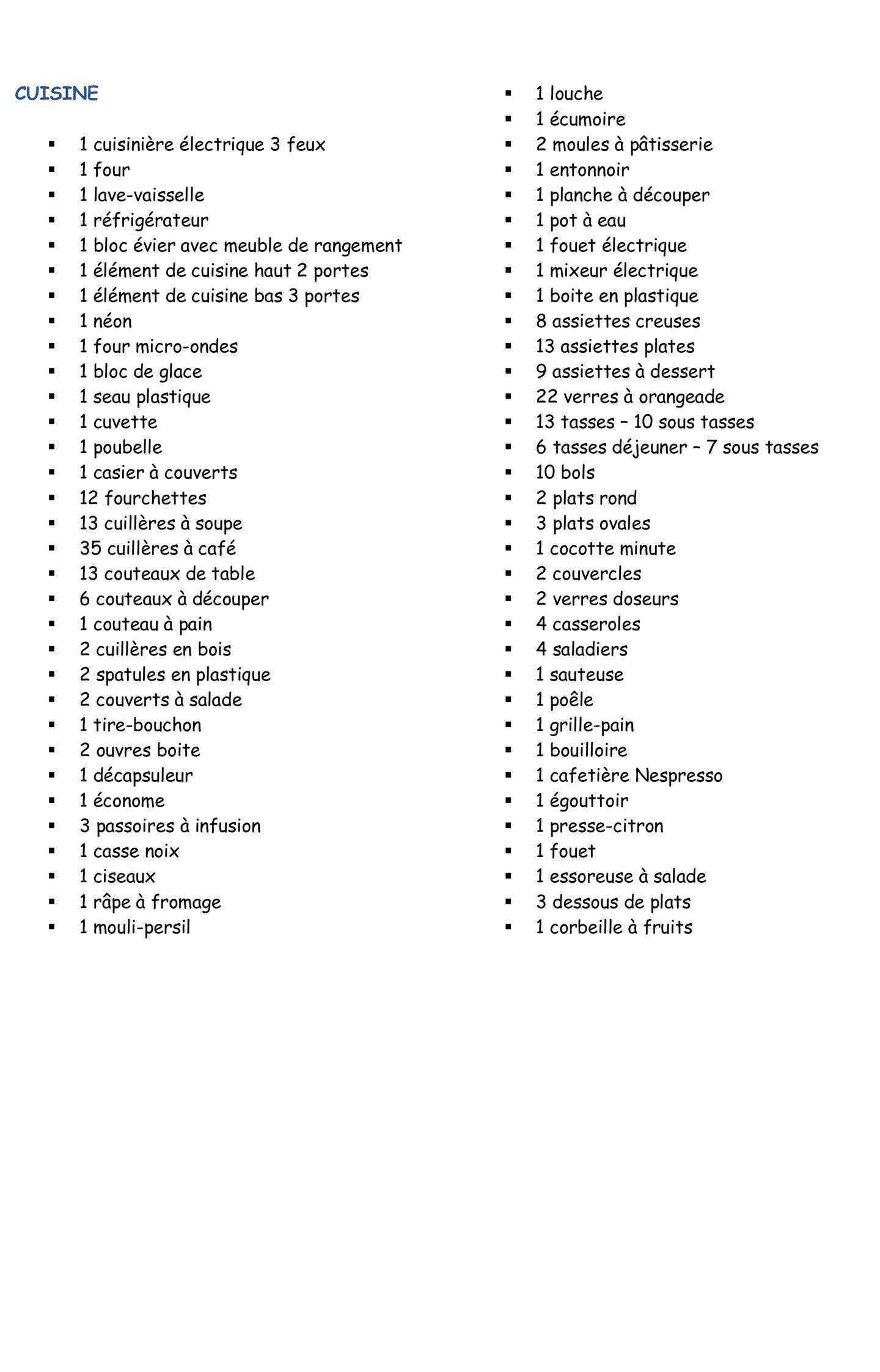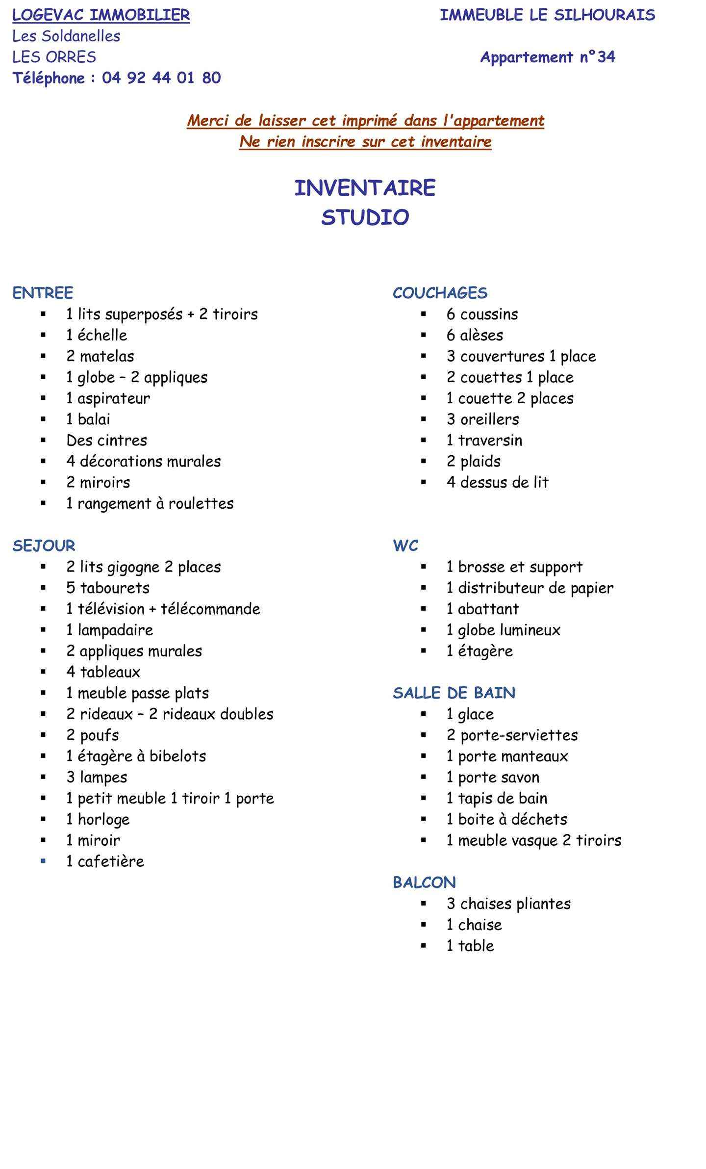 • Equipements : Four, Lave vaisselle, Micro onde, réfrigérateur, Chauffage Electrique, Moquette, Télévision