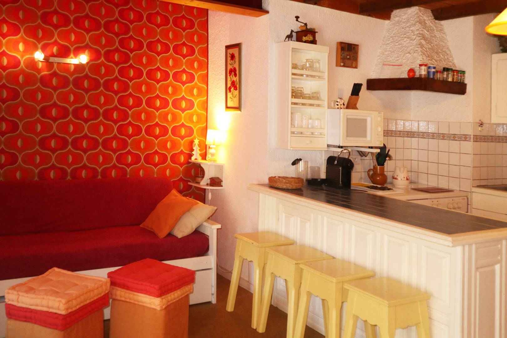 Studio équipé pour 4 personnes idéalement situé à deux pas du centre de la station avec départ skis aux pieds au 3ème étage avec ascenseur de la résidence, comprenant, une entrée, un coin montagne avec 2 lits superposés 1 place, un séjour avec 2 lits gigognes 1 place, un coin cuisine ouvert sur le séjour avec lave-vaisselle, une salle